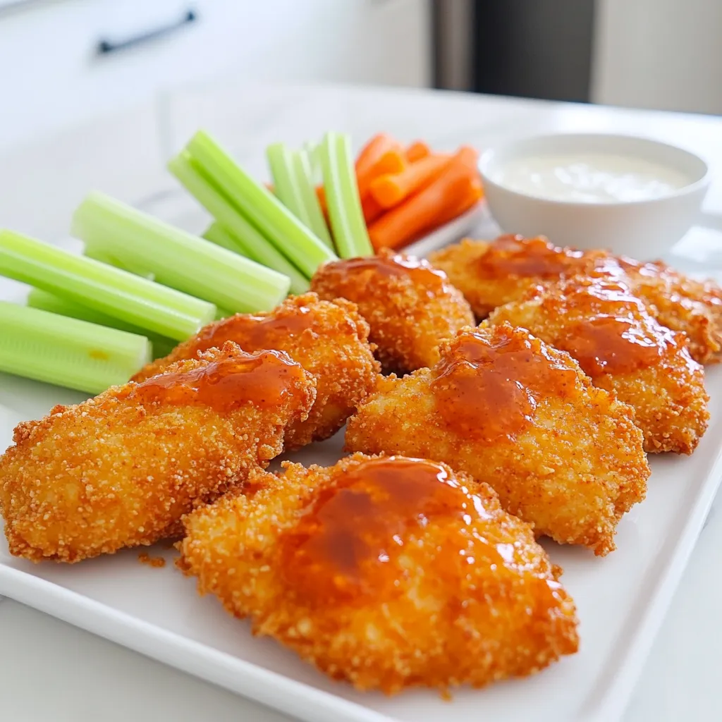 - 1 lb chicken tenders - 1 cup buttermilk - 1 cup all-purpose flour - 1 cup panko breadcrumbs - 1 teaspoon garlic powder - 1 teaspoon onion powder - 1 teaspoon smoked paprika - 1 teaspoon salt - ½ teaspoon black pepper - ½ cup buffalo sauce (mild or spicy, based on preference) To make great Air Fryer Crispy Buffalo Chicken Tenders, you need fresh, quality ingredients. The chicken tenders are the star here; they give you that juicy bite. Buttermilk is key for a tasty marinade. It tenderizes the chicken and adds flavor. For the breading, all-purpose flour and panko breadcrumbs join forces. The flour helps the coating stick, while panko gives that crispy crunch. You can’t forget the spices! Garlic powder, onion powder, smoked paprika, salt, and black pepper add layers of flavor. Finally, choose your buffalo sauce. You can go for mild if you want a hint of heat. Or, pick spicy for a kick! The sauce is what makes these tenders pop. Mix and match based on your taste. Each ingredient plays its part in making this dish a hit. Start by mixing the buttermilk with spices. In a bowl, whisk together 1 cup of buttermilk, 1 teaspoon of garlic powder, 1 teaspoon of onion powder, 1 teaspoon of smoked paprika, 1 teaspoon of salt, and ½ teaspoon of black pepper. This mix adds great flavor to the chicken. Next, marinate the chicken tenders. Place 1 pound of chicken tenders in the buttermilk mix, making sure they are fully submerged. Cover the bowl and refrigerate for at least 1 hour. For the best taste, marinate overnight. This allows the chicken to soak in all the delicious flavors. Now it’s time to set up your breading station. Use two bowls: one for the all-purpose flour and another for 1 cup of panko breadcrumbs. The flour helps the breadcrumbs stick better. Grab each chicken tender, coat it in flour first, then dip it back into the buttermilk, and finally coat it in panko. Press the breadcrumbs on gently. Before cooking, preheat the air fryer to 400°F (200°C) for about 5 minutes. Arrange the breaded chicken tenders in a single layer in the air fryer basket. Lightly spray them with cooking spray. This step is vital for crispy tenders. Cook for 10 to 12 minutes, flipping halfway. The chicken should be golden brown and reach an internal temperature of 165°F (74°C). After cooking, toss the chicken tenders in a clean bowl with ½ cup of buffalo sauce. Make sure each tender gets coated evenly. Serve them hot, and enjoy the spicy, crispy goodness! For a great presentation, serve with celery and carrot sticks, plus a side of ranch or blue cheese dressing for dipping. To get the crispiest chicken tenders, use cooking spray. This helps create a golden crust. Panko breadcrumbs are key too. They are lighter and crispier than regular breadcrumbs. Make sure to press the breadcrumbs onto the chicken to help them stick. This will give you a crunch that you will love. You can use mild or spicy buffalo sauce based on your taste. If you want a twist, try adding honey for sweetness. You can also mix in garlic powder for extra flavor. Don’t be afraid to experiment. Each sauce choice can change the whole dish. Serve your chicken tenders with creamy dips like ranch or blue cheese. Pair them with crunchy celery and carrot sticks for a fresh touch. Drizzle extra buffalo sauce on top for those who love spice. This adds color and flavor to the plate. Try these ideas to make your meal even better. {{image_2}} You can swap chicken tenders for chicken breasts. Cut them into strips for even cooking. If you want something different, try turkey or pork. Both work well and taste great with buffalo sauce. If you need a gluten-free dish, use gluten-free flour and breadcrumbs. They will replace the all-purpose flour and panko. Check labels to ensure that all your ingredients are gluten-free. This way, everyone can enjoy the meal. You can change the spices to create new flavors. For a spicy kick, add cayenne pepper or chili powder. If you like a sweeter taste, mix in honey with the buffalo sauce. You can even try different sauces like BBQ or teriyaki for a fun twist. Store your leftover chicken tenders in an airtight container. Make sure they are cool before sealing. Place them in the fridge. They will stay fresh for about three days. If you want to keep them longer, consider freezing. To reheat, use your air fryer for the best results. Preheat it to 375°F (190°C). Place the chicken tenders in a single layer. Heat for about 5-7 minutes. This helps maintain the crispy texture. Avoid using the microwave, as it can make the tenders soggy. To freeze, let the cooked chicken tenders cool completely. Then, place them in a freezer-safe bag. Remove as much air as possible. They can be frozen for up to three months. When ready to eat, thaw them in the fridge overnight. Reheat in the air fryer for that perfect crunch. You should marinate the chicken tenders for at least 1 hour. If you want more flavor, marinate them overnight. This time allows the spices to soak in, making the chicken tender and tasty. Yes, you can use frozen chicken tenders. However, you must adjust the cooking time. Cook them for about 15-18 minutes at 400°F. Ensure they reach an internal temperature of 165°F. Many sauces go well with buffalo chicken tenders. Here are some favorites: - Ranch dressing - Blue cheese dressing - Honey mustard - BBQ sauce These sauces balance spicy flavors and add creamy or sweet notes. Yes, you can air fry chicken tenders without breading. Simply marinate the chicken as you normally would. Then, place the marinated chicken directly in the air fryer. Cook at 400°F for about 10-12 minutes. This method keeps the chicken juicy and flavorful. You now have all you need to make delicious buffalo chicken tenders. Start with juicy chicken marinated in buttermilk and spices. Then, coat them in a crunchy mix of flour and panko before air frying. Don't forget to toss them in your favorite buffalo sauce for the perfect flavor. Experiment with diff
