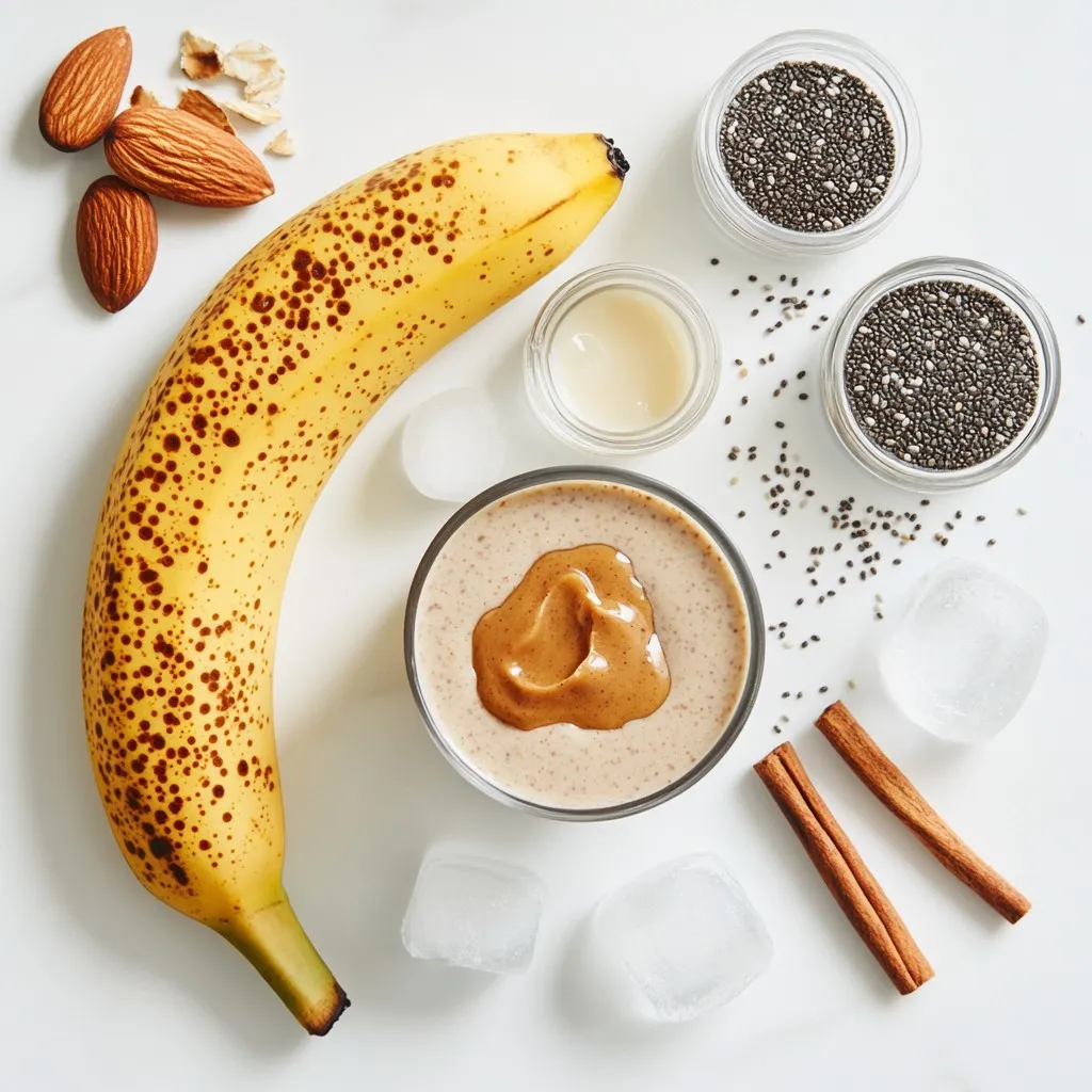 - 1 cup unsweetened almond milk - 2 tablespoons almond butter - 1 ripe banana - 1 scoop vanilla protein powder - 1 tablespoon chia seeds - 1 tablespoon honey or maple syrup (optional) - ½ teaspoon cinnamon - ½ cup ice cubes What is the nutritional profile of almond butter? Almond butter is rich in healthy fats. It has protein and fiber, too. It helps keep you full and satisfied. This nut butter also has vitamin E, which is good for your skin. The magnesium in almond butter supports muscle and nerve function. What are the benefits of chia seeds and their fiber content? Chia seeds are tiny but powerful. They are high in fiber, which aids digestion. This fiber helps you feel full longer. Chia seeds also have omega-3 fatty acids, which are good for heart health. They give your smoothie a nice texture and boost nutrition. What role do bananas play in smoothies? Bananas add natural sweetness and creaminess. They are a great source of potassium, which helps with muscle function. Bananas also provide quick energy. Their flavor blends well with almond butter and protein powder, making your smoothie delicious. {{ingredient_image_1}} Start by gathering all your ingredients. You will need almond milk, almond butter, banana, protein powder, chia seeds, cinnamon, and ice. Place the almond milk in your blender first. This helps the blender mix everything well. Next, add the almond butter. This nutty spread gives a rich flavor. Then, slice your ripe banana and toss it in. The banana adds creaminess and sweetness. After that, add your scoop of vanilla protein powder and chia seeds. These boost the nutrition of your smoothie. Sprinkle in the cinnamon for extra taste. Finally, throw in the ice cubes. The ice makes the smoothie cold and refreshing. Now, blend everything on high. Blend until the mixture is smooth and creamy. You shouldn’t see any chunks. If it seems too thick, add more almond milk. Blend again until it reaches the thickness you like. For the best look, pour your smoothie into a tall glass. A clear glass shows off its beautiful color. You can also use a jar for a trendy touch. This smoothie is perfect on its own. But you can pair it with snacks like nuts or fruit. It also goes well with a light meal, like a salad or toast. Enjoy your smoothie right away for the best taste! To make your smoothie pop, consider adding a pinch of nutmeg or cardamom. These spices bring warmth and depth to the flavor. You can also try a dash of vanilla extract for an extra sweet note. If you want to sweeten your smoothie, honey and maple syrup work great. You can also use agave nectar or stevia for a different taste. Each sweetener changes the flavor slightly, so try different ones to find your favorite. You can customize this smoothie to fit your needs. For a nut-free option, swap almond butter for sunflower seed butter. If you're dairy-free, stick with almond milk or use oat milk. For vegan diets, choose plant-based protein powder. You can also substitute the banana with avocado for a creamier texture. If you want more fiber, add flax seeds instead of chia seeds. Have fun and make it your own! Pro Tips Use Frozen Bananas: For a thicker, creamier texture, consider using frozen bananas instead of fresh. This will also chill your smoothie without needing extra ice. Protein Powder Alternatives: If you don't have vanilla protein powder, you can substitute it with a scoop of your favorite protein powder or even omit it for a lighter smoothie. Customize Sweetness: Adjust the sweetness according to your taste. Start with a small amount of honey or maple syrup, and add more as needed. Add Greens: Sneak in some spinach or kale for added nutrients without altering the taste. This is a great way to boost the health benefits of your smoothie. {{image_2}} For a vegan twist, swap the protein powder for a plant-based option. You can use pea protein or brown rice protein. These options keep the smoothie creamy and tasty. Instead of honey, use maple syrup or agave nectar for sweetness. This keeps your drink fully vegan. To make a keto-friendly version, focus on low-carb ingredients. Replace the banana with half an avocado for creaminess and healthy fats. Use unsweetened almond milk to keep carbs low. You can skip the honey or maple syrup. This way, you'll enjoy a tasty smoothie that fits your low-carb needs. Want to boost your nutrition? Add superfoods like spinach or kale to your smoothie. These greens add vitamins without changing the taste much. You can also toss in a scoop of hemp seeds or flaxseeds. They give extra protein and healthy fats. Mix and match these options to make your smoothie even better! To keep your leftover Almond Butter Protein Smoothie fresh, store it in the fridge. Use an airtight container or a jar with a tight lid. This helps prevent any weird smells or flavors from getting in. Drink it within 24 hours for the best taste and texture. If you notice separation, just give it a quick shake or stir before drinking. If you want to save your smoothie for later, freezing is a great option. Pour the smoothie into ice cube trays or freezer-safe bags. Make sure to leave some space in the container, as the smoothie will expand when it freezes. When you are ready to enjoy it, take the cubes out and let them thaw in the fridge overnight. You can also blend the frozen cubes with a little almond milk for a quick treat. You can use peanut butter instead of almond butter. Sunflower seed butter is another great option. Both keep the taste rich and creamy. If you want a nut-free option, try tahini. Each option adds unique flavors, so feel free to explore! To lower the calories in your smoothie, use light almond milk. You can skip the honey or maple syrup if you prefer less sweetness. Use half a banana instead of a whole one. Adding more ice can help make it feel fuller without adding calories. Yes, frozen bananas work well in this smoothie! They make the drink creamier and colder. Just toss them in the blender like fres