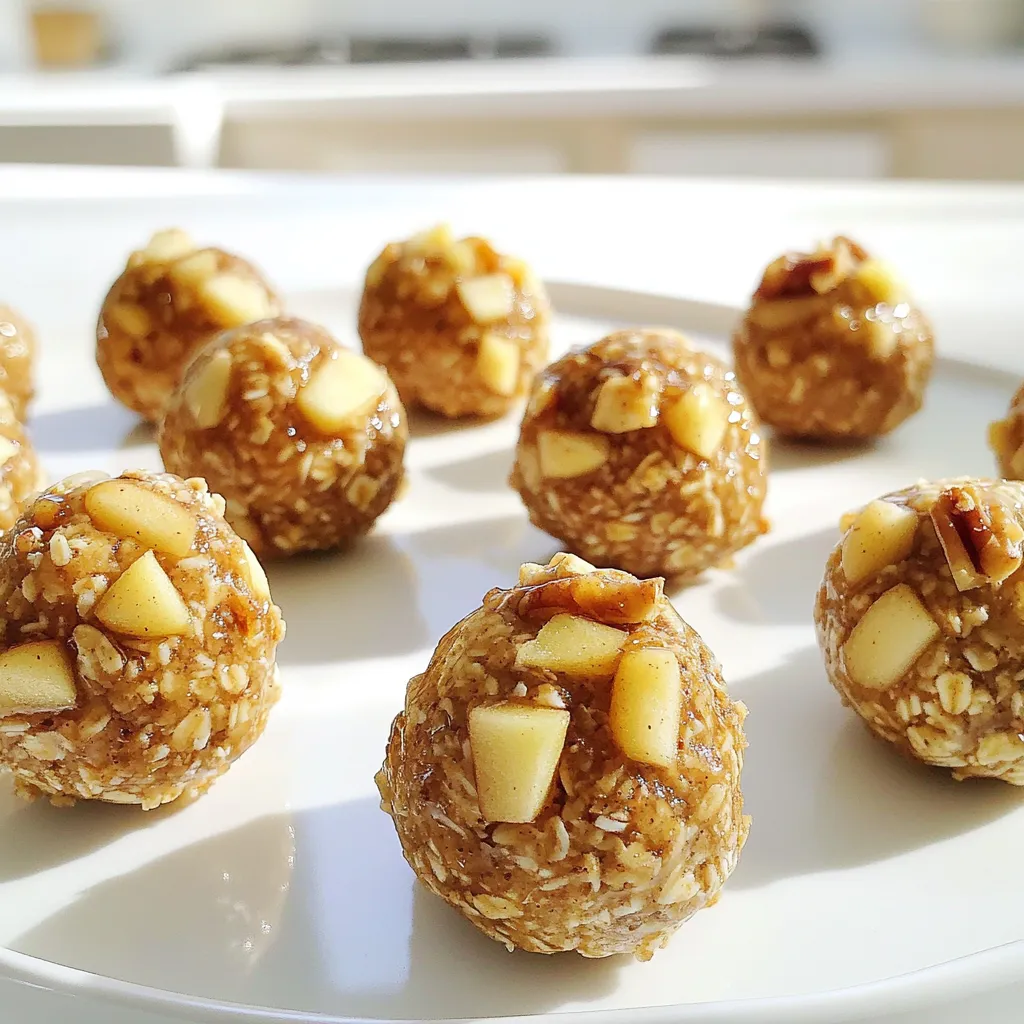To make Apple Cinnamon Energy Balls, you need these main items: - 1 cup rolled oats - 1/2 cup almond butter (or any nut butter) - 1/2 cup finely chopped dried apples - 1/4 cup honey or maple syrup - 1 teaspoon ground cinnamon - 1/4 teaspoon nutmeg - Pinch of salt These ingredients come together to create a tasty and healthy snack. You can add more flavor and crunch with these optional ingredients: - 1/4 cup chopped walnuts - 1/4 cup mini chocolate chips (for a sweet twist) - 1/4 cup shredded coconut These extras can make your energy balls even more delightful. Each ingredient has its own health perks: - Rolled oats: Great for energy and full of fiber. They help you feel full. - Almond butter: Packed with healthy fats and protein. It gives you lasting energy. - Dried apples: Provide natural sweetness and vitamins like A and C. - Honey or maple syrup: Natural sweeteners that add flavor and quick energy. - Cinnamon: Adds flavor and may help control blood sugar levels. - Nutmeg: Gives warmth and may boost digestion. - Walnuts: Offer omega-3 fatty acids, which are good for your heart. Using these ingredients, you create a snack that fuels your body and tastes great! First, gather your dry ingredients. You need: - 1 cup rolled oats - 1/2 cup finely chopped dried apples - 1 teaspoon ground cinnamon - 1/4 teaspoon nutmeg - Pinch of salt - 1/4 cup chopped walnuts (optional) In a mixing bowl, add rolled oats, chopped dried apples, and walnuts if you like. Sprinkle in the cinnamon, nutmeg, and salt. Now, stir everything well. This helps mix the flavors, so every bite is tasty. Next, we will mix the wet ingredients. You need: - 1/2 cup almond butter (or your favorite nut butter) - 1/4 cup honey or maple syrup In a separate bowl, add almond butter and honey (or maple syrup). Mix until it becomes smooth and creamy. This step is key for binding the energy balls together. Now, it’s time to make the energy balls. Pour the wet mixture into the dry ingredients. Mix it all together until it’s well combined and sticky. Use your hands to scoop out small portions of the mixture, about 1 tablespoon each. Roll them into balls. If it feels too sticky, chill the mixture in the fridge for a few minutes. Place the energy balls on a parchment-lined tray. Chill them in the fridge for at least 30 minutes to firm up. After that, store the balls in an airtight container. Enjoy them for up to one week! To get the best texture, balance is key. You want your energy balls to be sticky but not too wet. Use rolled oats for a chewy base. If the mixture feels too dry, add a bit more almond butter or honey. If it’s too sticky, chill it for a few minutes. This makes rolling easier. The goal is a firm but soft ball. Store your energy balls in an airtight container. This keeps them fresh for up to one week. Place them in the fridge to maintain their texture. If you want longer storage, freeze them. Just remember to let them thaw before eating. This helps keep them tasty and healthy. Enjoy these energy balls as a quick snack. They pair well with fruit or yogurt for breakfast. You can also take them on hikes or to work for a boost. For a fun twist, try drizzling some nut butter on top. This adds flavor and makes them even more satisfying. {{image_2}} You can use many nut butters for your energy balls. Almond butter is great, but peanut butter adds a fun twist. Sunflower seed butter is a good choice if you need nut-free. Each nut butter brings its own flavor and texture. Just keep the same amount as the recipe calls for. Want to add more nutrients? Try mixing in chia seeds or flaxseeds. These tiny seeds pack a lot of fiber and healthy fats. You might also add protein powder for an energy boost. Dried fruits like cranberries or raisins can add sweetness too. Just remember to keep the total amount of mix-ins around half a cup. You can change the flavor of your energy balls easily. Swap out the cinnamon for pumpkin spice for fall vibes. Or, try adding cocoa powder for a chocolatey kick. Vanilla extract can also enhance the taste. Don’t be afraid to get creative with what you have at home. Each swap can lead to a new favorite snack! To keep your Apple Cinnamon Energy Balls fresh, use an airtight container. This helps prevent them from drying out. I recommend placing parchment paper between layers. This keeps them from sticking together. Store them in the fridge for the best taste and texture. They stay good for up to one week. Freezing these energy balls is a great way to keep them longer. After forming the balls, place them on a baking sheet. Make sure they are not touching each other. Freeze them for about an hour. Once firm, transfer them to a freezer bag. Label the bag with the date. They can last up to three months in the freezer. When ready to eat, thaw them in the fridge overnight. These energy balls have a shelf life of one week in the fridge. If stored properly in the freezer, they last for three months. Always check for signs of spoilage before eating. If they smell off or change color, it’s best to toss them. Enjoying your energy balls fresh ensures the best flavor and nutrition. Yes, you can easily make these energy balls vegan. Just swap honey with maple syrup. This change keeps the sweetness but keeps it plant-based. You can also use almond butter or any nut butter. Both options are vegan-friendly and add flavor. Each energy ball has about 100 calories. This number can change based on the nut butter you use and if you add walnuts. If you want a lower-calorie snack, use less nut butter or skip the nuts. These energy balls are a great choice for a healthy snack. If your mixture is too sticky, try chilling it in the fridge. Refrigerating for about 10 minutes helps firm it up. You can also wet your hands with water when rolling the balls. This trick makes it easier to shape them without sticking to your hands. You learned how to make healthy apple cinnamon energy balls. We covered the key ingredients, step-by-step instr