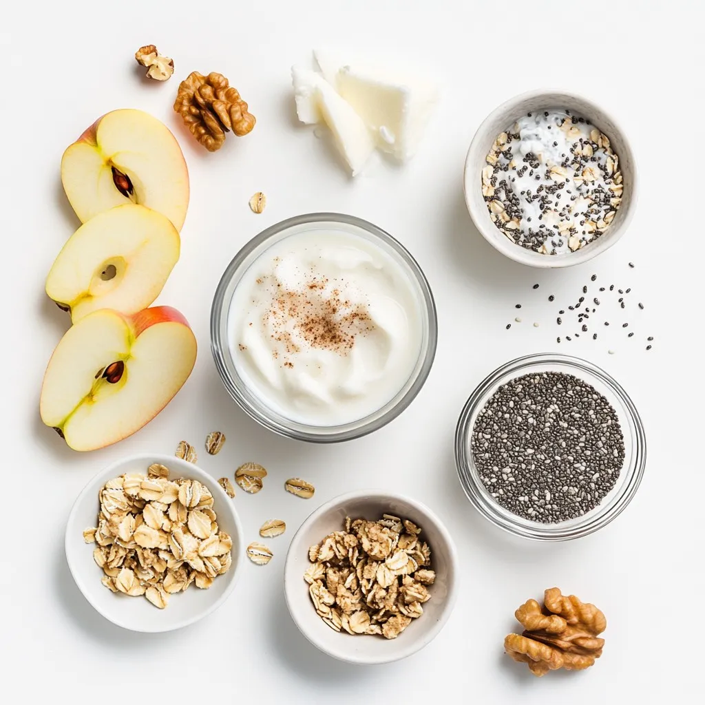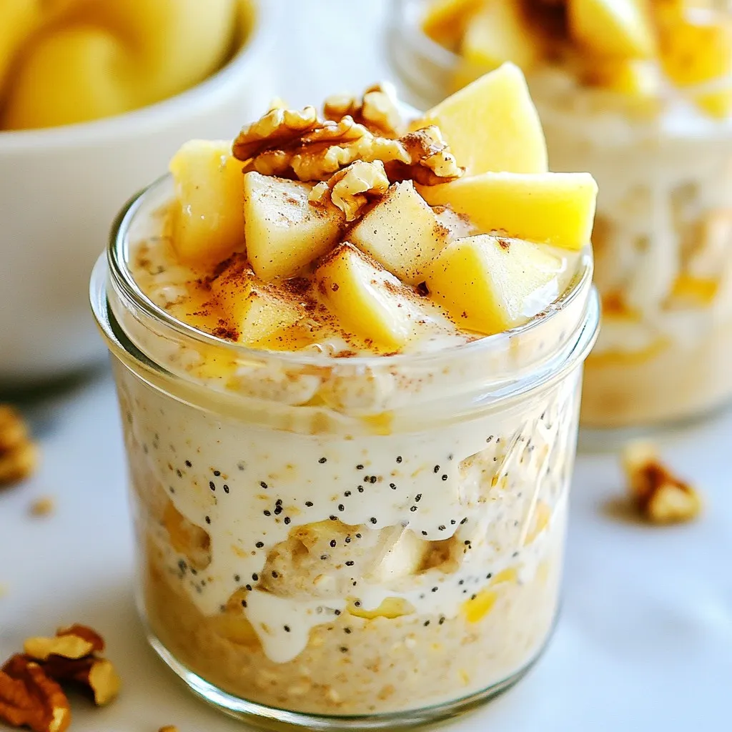 To make Apple Pie Overnight Oats, gather these key ingredients: - 1 cup rolled oats - 1 ½ cups almond milk (or any milk of choice) - 1 apple, peeled and diced - 1 teaspoon cinnamon - 1 tablespoon maple syrup (or honey) - 1 tablespoon chia seeds - ¼ teaspoon nutmeg - A pinch of salt These ingredients form the base of the dish. Rolled oats provide texture, while almond milk keeps it creamy. You can add a few special touches to make your oats even better: - 2 tablespoons Greek yogurt (optional for creaminess) - 2 tablespoons chopped walnuts (for topping) - Additional apple slices (for garnish) Greek yogurt adds a rich texture, while walnuts give a nice crunch. Extra apple slices can make your dish look pretty. This recipe serves two people. Each serving is healthy and filling. Here’s a quick look at the nutrition: - Rolled oats are high in fiber. They help you feel full. - Apples offer vitamins and minerals. They add sweetness too. - Chia seeds provide omega-3 fatty acids. They are good for your heart. - Maple syrup is a natural sweetener, but you can use honey if you prefer. Overall, these ingredients create a well-rounded breakfast. It’s a perfect way to start your day. {{ingredient_image_1}} Start by taking a medium bowl. In this bowl, combine one cup of rolled oats, one and a half cups of almond milk, and one tablespoon of chia seeds. Stir the mixture well. This helps spread the chia seeds evenly. Next, add in one peeled and diced apple, one teaspoon of cinnamon, and a quarter teaspoon of nutmeg. Also, pour in one tablespoon of maple syrup and a pinch of salt. Gently fold all the ingredients together until they blend well. If you like creaminess, mix in two tablespoons of Greek yogurt now. Once your base mixture is ready, divide it into two jars or bowls. Seal them tightly. This keeps the flavors locked in. Refrigerate the jars overnight. This soaking time allows the oats to absorb the almond milk and the tasty flavors. When morning comes, take the jars out. Give the oats a good stir. If they seem too thick, add a little more almond milk to make them just right. When it’s time to serve, top each jar with two tablespoons of chopped walnuts. This adds a nice crunch. You can also add extra apple slices for garnish. If you want more sweetness, drizzle a little more maple syrup on top. For a beautiful look, serve the oats in glass jars. Layer them with apple slices and sprinkle some cinnamon on top. This makes your breakfast not only tasty but also pretty! To make your overnight oats perfect, use rolled oats. They absorb liquid well and stay chewy. Always mix the oats and milk first. Then add the other ingredients. This helps the oats soak in flavors better. Use a jar for easy storage and serving. Glass jars show off the layers and look nice. You can change the sweetness to fit your taste. If you like it sweeter, add more maple syrup or honey. For less sweetness, cut back a bit. Spice is key too. If you love cinnamon, add a little extra. Nutmeg adds warmth, so adjust it to your liking. Taste the mix before it chills to find the right balance. The texture matters for a great eating experience. If your oats are too thick in the morning, just add more almond milk. Stir it well until it feels creamy. If you like it creamy, mix in Greek yogurt. This makes the overnight oats rich and smooth. Topping with walnuts gives a nice crunch, too. Pro Tips Use Fresh Apples: For the best flavor, opt for crisp, fresh apples like Honeycrisp or Granny Smith. They add a delightful sweetness and texture. Experiment with Milk: While almond milk is great, try using oat milk or coconut milk for a different flavor profile that complements the apple pie taste. Customize Sweetness: Adjust the sweetness by varying the amount of maple syrup or honey based on your preference for sweetness levels in your oats. Make Ahead: Prepare multiple jars at once for a quick breakfast throughout the week. Just grab a jar and go! {{image_2}} To make your Apple Pie Overnight Oats dairy-free, use almond milk. You can also try coconut milk or oat milk. Each option gives a unique flavor and creaminess. This way, everyone can enjoy this dish. If you skip the Greek yogurt, it stays dairy-free, too. Want to boost flavor and nutrition? Try adding nuts or seeds. Sliced almonds add a nice crunch. You can also mix in flaxseeds for extra fiber. Dried fruits, like raisins or cranberries, add sweetness. If you enjoy spices, consider adding ginger or allspice for a warm kick. You can swap the apple with other fruits. In fall, try pears for a sweet twist. In summer, fresh berries work well, too. Bananas add a creamy texture and natural sweetness. Just remember to adjust sweeteners based on the fruit you choose. Your oats will still taste amazing! After making your apple pie overnight oats, store any leftovers in the fridge. Use airtight jars or containers to keep them fresh. This helps prevent the oats from drying out or absorbing too many odors from your fridge. You can keep your overnight oats in the fridge for up to five days. However, the best taste comes within the first three days. After that, the oats may become too soft. To keep the flavor fresh, make small batches. If you prefer warm oats, you can reheat them. Simply transfer the oats to a microwave-safe bowl. Heat in short bursts, about 30 seconds at a time. Stir between each interval until they reach your desired warmth. If too thick, add a splash of almond milk while heating. Yes, you can use instant oats. They will absorb liquid faster than rolled oats. This means your overnight oats may be softer. The taste stays great, but the texture will change. If you like a creamier feel, instant oats work well. Overnight oats can last up to five days in the fridge. Just make sure to keep them in a sealed container. This helps keep them fresh. If you add fresh fruit, it’s best to eat them within a couple of days. Yes, you can easily make this recipe vegan. Simply use almond milk or any pla