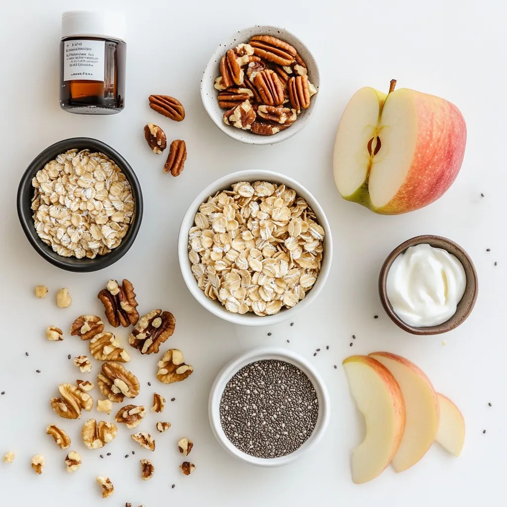 The main ingredients for Apple Pie Overnight Oats are simple and easy to find. Rolled oats form the base, giving the dish a hearty texture. Unsweetened almond milk, or any milk you prefer, adds creaminess. Diced apples bring in sweetness and a fresh crunch.