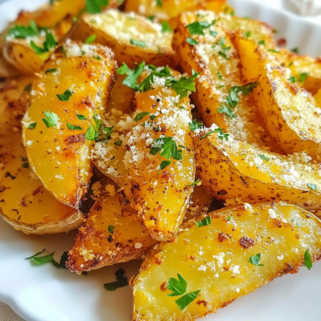 - 4 large russet potatoes - 1/4 cup olive oil - 6 cloves garlic, minced - 1 cup grated Parmesan cheese To make baked garlic Parmesan potato wedges, you need the right ingredients. Start with russet potatoes. They are perfect for this dish due to their starchy texture. The olive oil helps to crisp the wedges in the oven. The minced garlic adds a strong flavor that everyone loves. Lastly, the grated Parmesan cheese gives the wedges a rich, cheesy taste. - 2 teaspoons dried oregano - 1 teaspoon garlic powder - 1 teaspoon paprika - Salt and pepper to taste Seasonings are key to great flavor. Dried oregano brings an herb taste. Garlic powder boosts the garlic flavor even more. Paprika adds a slight smokiness. Don’t forget to add salt and pepper to balance the taste. Adjust these to your liking for the best results. - Fresh parsley, chopped (for garnish) Garnish can elevate your dish. Fresh parsley adds a pop of color and freshness. It makes the wedges look more appealing. You can sprinkle it on right before serving. This small step makes a big difference in presentation. {{ingredient_image_1}} First, wash and scrub the potatoes well. This step is key to remove dirt. I prefer russet potatoes for their texture. Next, cut each potato into wedges. Aim for about eight wedges per potato. This size helps them cook evenly. In a large bowl, combine the olive oil, minced garlic, oregano, garlic powder, paprika, salt, and pepper. Mix these ingredients well. This blend adds a great flavor to the wedges. The garlic gives them a nice kick, while the Parmesan will add richness. Add the potato wedges to the bowl with the seasoning. Toss the wedges in the mixture until they are coated evenly. Make sure every wedge is covered. This coating makes them tasty and helps them crisp up while baking. Arrange the coated wedges in a single layer on a baking sheet. Lining the sheet with parchment paper helps with cleanup. Now, sprinkle the grated Parmesan cheese generously over each wedge. Bake in your preheated oven for 30 to 35 minutes. Remember to flip them halfway through. This ensures they get golden brown on all sides. Enjoy the aroma as they bake! - Preheat the oven properly. A hot oven helps the wedges cook well and get crispy. Set it to 425°F (220°C) before you start. This step makes a big difference in texture. - Do not overcrowd the baking sheet. Give each wedge space. If they are too close, they will steam instead of crisp up. Use two sheets if needed to keep them apart. - Experiment with additional spices or herbs. You can add your favorites! Try cajun seasoning for heat, or rosemary for a fresh taste. A pinch of cumin can also add a nice twist. The key is to find what you love! - Pair with dips or sauces. These wedges taste great with ranch, ketchup, or even a spicy mayo. Dipping adds fun and flavor. You can also serve them with a tangy yogurt sauce for a fresh kick. Enjoy mixing and matching! Pro Tips Choose the Right Potatoes: For the best results, opt for russet potatoes as they have a starchy texture that crisps up beautifully in the oven. Don’t Skimp on the Oil: Ensure that the potato wedges are well-coated in olive oil; this helps them achieve that desired crispy exterior. Mix Up the Seasonings: Feel free to experiment with additional spices like cayenne pepper or Italian seasoning for a flavor boost. Rest Before Serving: Allow the wedges to rest for a few minutes after baking; this helps them firm up and enhances their crispiness. {{image_2}} You can make these potato wedges even better by adding cheese. Just sprinkle some shredded cheese on top before baking. Cheddar, mozzarella, or a mix of cheeses work well. The cheese will melt and create a tasty crust. It adds creaminess and a rich flavor. Trust me, your taste buds will thank you! If you like heat, try adding cayenne pepper or chili powder. Just sprinkle a little over the potato wedges in the seasoning mix. Start with a small amount, and adjust to your spice level. The heat from the spices will give your wedges a nice kick. It’s a fun way to change up the flavor! Fresh herbs can bring a new life to your potato wedges. Try using rosemary or thyme. Chop the herbs finely and mix them in with the olive oil and seasonings. This adds a fresh, aromatic taste to the dish. You’ll enjoy the blend of garlic and herbs in each bite! To store your baked garlic Parmesan potato wedges, place them in an airtight container. This keeps them fresh. Make sure to let them cool completely before sealing. They will last in the fridge for up to three days. If you want to enjoy them later, refrigerate them right after they cool. For the best crispy texture, I recommend reheating in the oven. Preheat your oven to 400°F (200°C). Spread the potato wedges on a baking sheet. Bake for about 10 to 15 minutes. This method revives their crunchiness. If you want a quicker option, you can use a microwave, but they may turn soft. Yes, you can freeze these potato wedges! To freeze, let them cool completely. Place them in a freezer-safe bag or container. Make sure to remove as much air as possible. They can stay in the freezer for up to three months. When you’re ready to eat them, thaw in the fridge overnight before reheating. Russet potatoes work best for wedges. They have a high starch content. This makes them crisp on the outside and fluffy on the inside. Yukon Gold potatoes are another good choice. They add a buttery flavor and a creamy texture. Both types hold up well during baking. Yes, you can prepare them ahead of time! Cut the potatoes into wedges and soak them in water. This helps remove excess starch and keeps them from browning. You can store the soaked wedges in the fridge for up to 24 hours. When you’re ready to cook, just drain and dry them. Toss with the seasoning and bake as usual. To make these wedges vegan, you can simply swap the Parmesan cheese. Use nutritional yeast for a cheesy flavor without dairy. You can also use a vegan cheese substitute. Ju