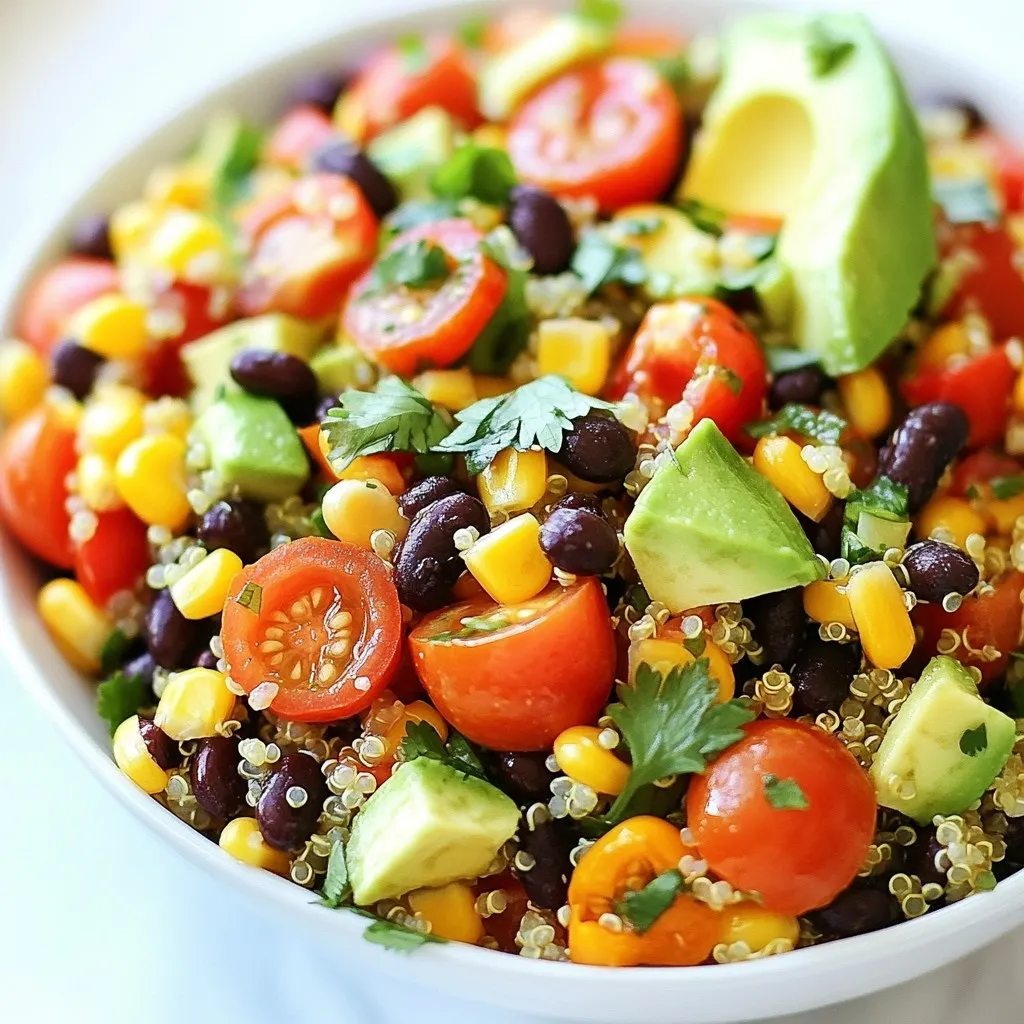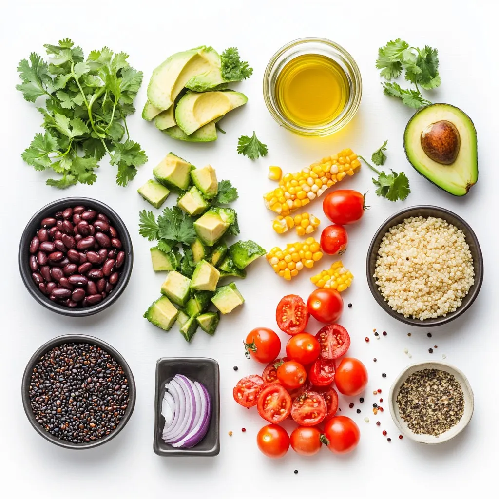 The main ingredients in this salad create a colorful and tasty mix. Quinoa serves as the base. It is a great source of protein. Black beans add fiber and a rich flavor. Fresh vegetables like bell peppers, cherry tomatoes, red onion, and corn boost both taste and nutrition. Each adds a crunch, sweetness, or zest. Avocado adds creaminess, making each bite delightful. Fresh cilantro brings a burst of freshness. Together, they create a balanced and vibrant dish.