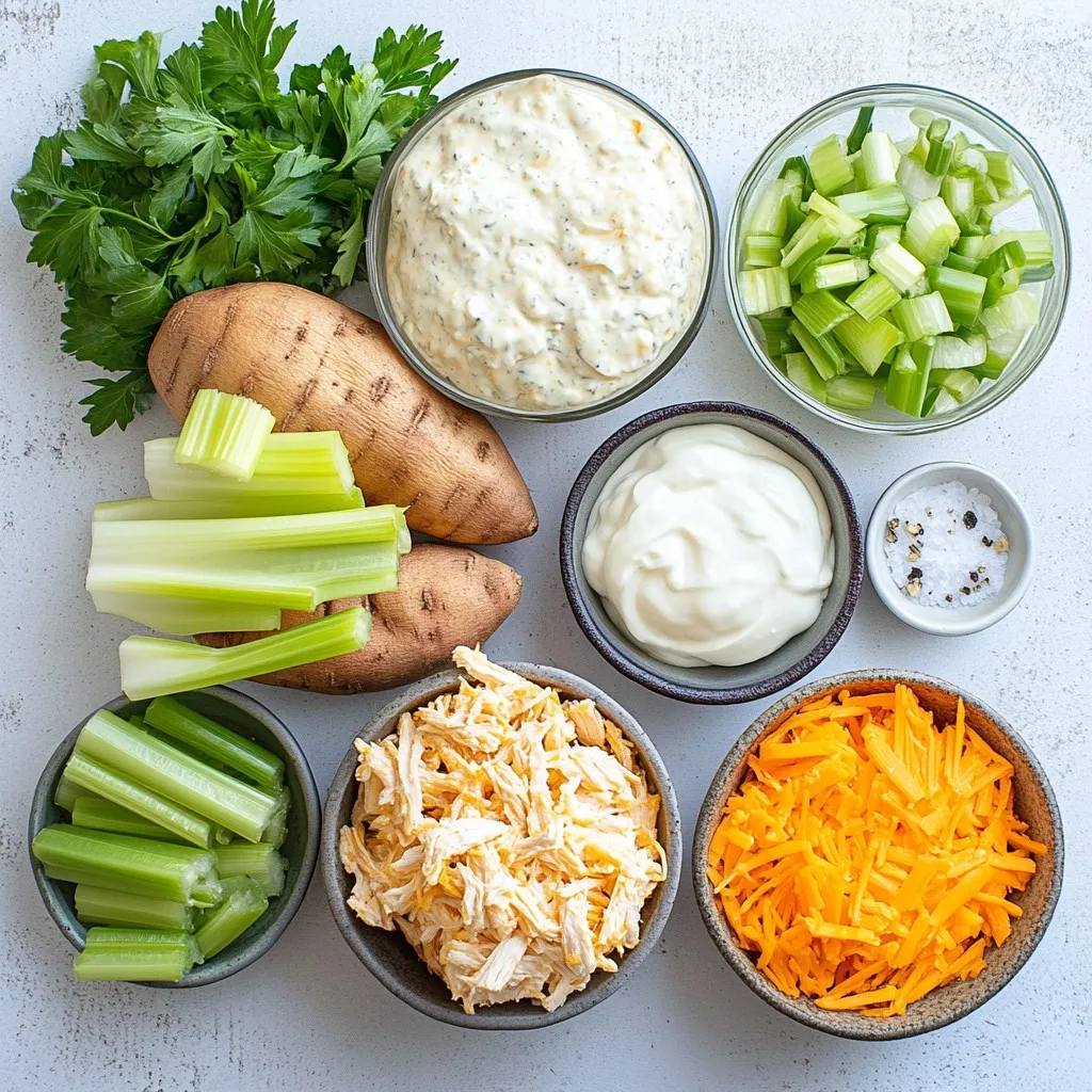 To make Buffalo Chicken Stuffed Sweet Potatoes, you need a few simple ingredients. Here’s the list: