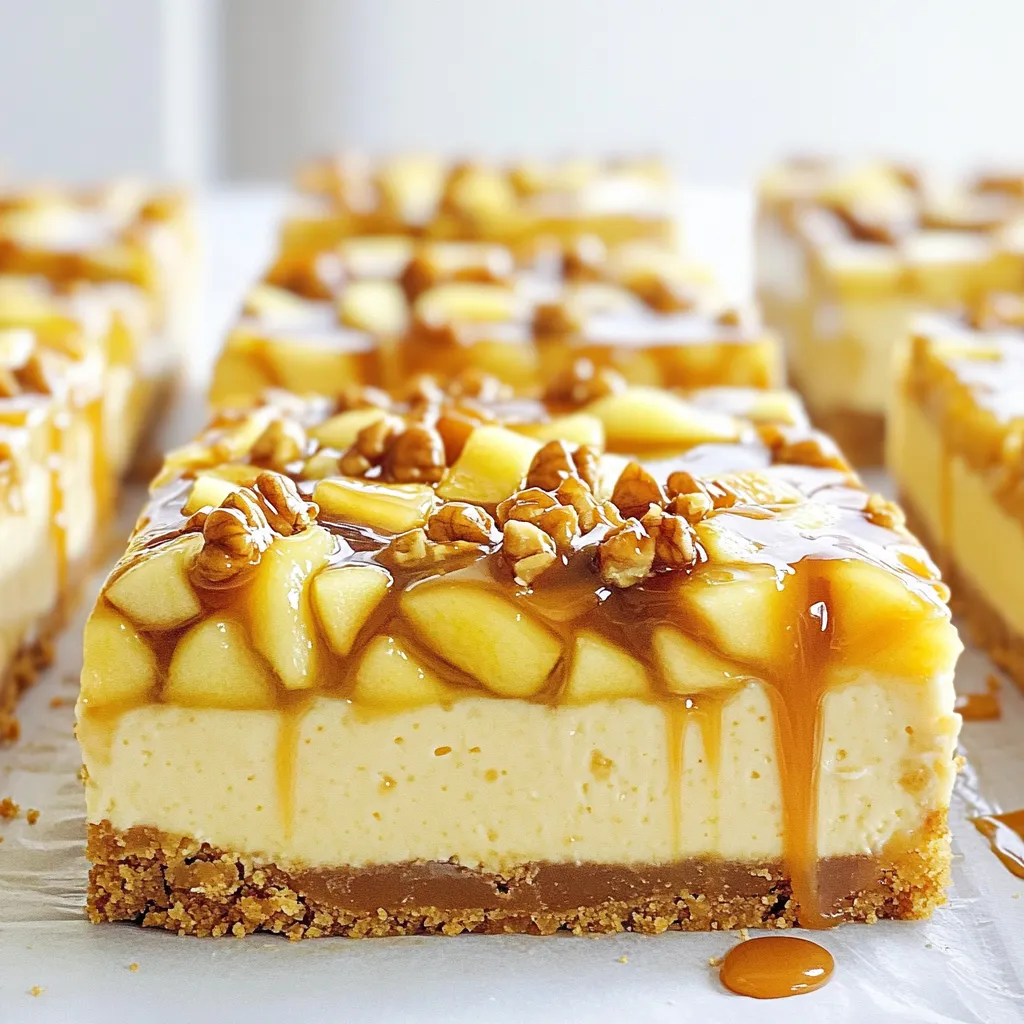 To make these delicious bars, you will need: - 1 ½ cups graham cracker crumbs - ½ cup unsalted butter, melted - 1 cup cream cheese, softened - ½ cup granulated sugar - 2 large eggs - 1 teaspoon vanilla extract - 2 medium apples, peeled, cored, and diced (preferably Granny Smith) - 1 teaspoon ground cinnamon - ½ cup caramel sauce (store-bought or homemade) - ¼ cup chopped walnuts or pecans (optional) You can enhance these cheesecake bars with a few extra ingredients: - A pinch of nutmeg for warmth - A handful of raisins for extra sweetness - A dash of lemon juice to balance the flavors - A tablespoon of apple cider for a tangy twist If you need alternatives, here are options you can use: - Use coconut oil instead of butter for a dairy-free crust. - Substitute dairy cream cheese with vegan cream cheese for a plant-based option. - Try honey or maple syrup in place of granulated sugar for a natural sweetener. - Swap Granny Smith apples with Honeycrisp for more sweetness. These ingredients form the base for a rich and tasty treat, perfect for fall. Each choice impacts flavor, so feel free to experiment! Start by preheating your oven to 350°F (175°C). Next, take a 9x9 inch baking dish and line it with parchment paper. Leave some paper hanging over the sides. This makes it easy to lift the bars out later. In a medium bowl, mix 1 ½ cups of graham cracker crumbs with ½ cup of melted unsalted butter. Stir until it looks like wet sand. Press this mixture into the bottom of your baking dish. Make sure it is packed tight. Bake the crust for 8-10 minutes until it turns lightly golden. After that, take it out and let it cool for a bit. In a large bowl, beat 1 cup of softened cream cheese with ½ cup of granulated sugar. Use an electric mixer to make it smooth and creamy. Add in 2 large eggs, one at a time. Mix well after each egg. Then, stir in 1 teaspoon of vanilla extract. Now, fold in 2 medium diced apples and 1 teaspoon of ground cinnamon. Make sure everything is mixed evenly. Pour the cream cheese mixture over your cooled crust. Spread it out evenly. Drizzle ½ cup of caramel sauce over the top. Use a knife or toothpick to swirl the caramel into the mixture. If you want some crunch, sprinkle ¼ cup of chopped walnuts or pecans on top. Now, pop the dish into the oven and bake for 35-40 minutes. You want the center to be set and the edges to puff up slightly. Once baked, let the bars cool at room temperature for about 30 minutes. Then, refrigerate them for at least 2 hours, or overnight if you can wait, before cutting them into bars. To make the best caramel apple cheesecake bars, use fresh apples. Granny Smith apples add a nice tartness that balances the sweetness. Make sure to soften the cream cheese before mixing. This step helps you avoid lumps in your batter. When you press the graham cracker crust, ensure it is firm and even. A well-formed crust holds the filling better. One common mistake is overbaking the bars. Keep an eye on them, and pull them out when the center is just set. This keeps your bars creamy. Don’t skip the cooling time after baking. This step helps the bars firm up. If you don’t refrigerate long enough, they may fall apart when cut. Also, avoid using too much caramel. A drizzle is enough for flavor without making it too sweet. Serve these bars chilled for the best texture. Pair them with whipped cream for added creaminess. A scoop of vanilla ice cream complements the flavors well. For a fun twist, try drizzling extra caramel or even chocolate sauce on top. Garnish with a sprinkle of cinnamon or chopped nuts for extra crunch. These bars are perfect for fall gatherings or cozy family nights. {{image_2}} To make gluten-free caramel apple cheesecake bars, swap regular graham cracker crumbs for gluten-free ones. You can find these in most grocery stores. Check the labels to ensure they are safe for your needs. Use the same amount—1 ½ cups—so you keep the crust nice and firm. If you need a dairy-free option, replace cream cheese with a dairy-free cream cheese alternative. There are many brands available now. For the butter, use coconut oil or a dairy-free margarine. This keeps your bars creamy and tasty without any dairy. You can add your favorite spices to change the taste. Try a pinch of nutmeg or allspice for a warm flavor. Instead of apples, think about using pears for a twist. Want some crunch? Add ¼ cup of chopped pecans or almonds to the apple mix. You can also mix in dried cranberries for a fun surprise! To keep your Caramel Apple Cheesecake Bars fresh, place them in an airtight container. Store them in the fridge for up to five days. If you leave them out, they can spoil quickly. You can freeze these bars for longer storage. First, let the bars cool completely. Then, cut them into squares. Wrap each square tightly in plastic wrap, and place them in a freezer-safe bag. They will stay good for up to three months. To enjoy later, just thaw them in the fridge overnight. To reheat, place a bar in the microwave for about 15-20 seconds. This warms it up without cooking it further. You can also enjoy them cold straight from the fridge. The flavors will still shine through! Caramel Apple Cheesecake Bars last about five days in the fridge. Store them in an airtight container. If you want them to last longer, you can freeze them. When frozen, they can last up to three months. Yes, you can make these bars ahead of time. They taste even better after chilling overnight. You can bake them a day before your event. Just let them cool, then store them in the fridge. If you need a substitute for cream cheese, use Greek yogurt or mascarpone cheese. These options keep the creamy texture. You can also try silken tofu for a dairy-free choice. Just blend it well before adding. To add more caramel flavor, drizzle extra caramel sauce on top before serving. You can also mix some caramel into the cheesecake batter. For a fun twist, add caramel bits to the apple mixture. You learned 