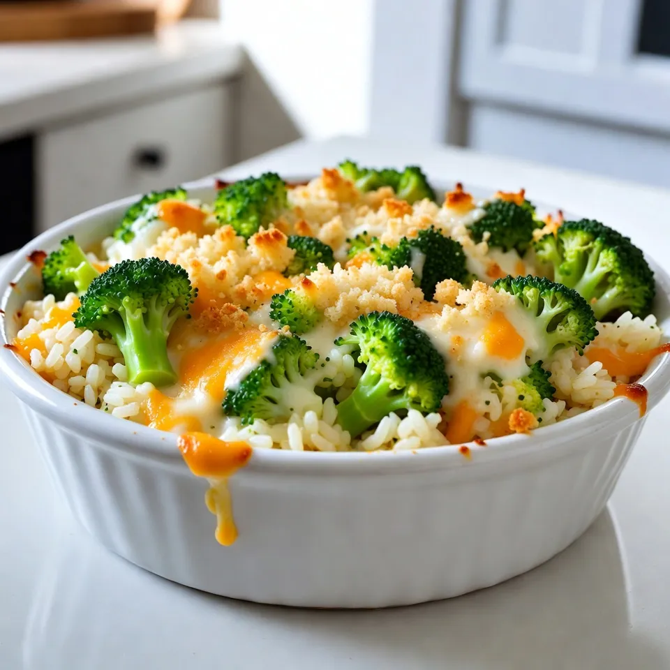 To make Cheesy Broccoli Rice Casserole, gather these simple ingredients: - 2 cups cooked rice (white or brown) - 1 large head of broccoli, chopped into small florets - 1 cup shredded cheddar cheese - 1 cup cream of mushroom soup (or homemade) - 1/2 cup milk - 1/2 cup onion, finely chopped - 1/2 teaspoon garlic powder - 1/2 teaspoon black pepper - 1/4 teaspoon salt - 1/2 cup crispy breadcrumbs (optional for topping) - 2 tablespoons olive oil or butter for sautéing Each ingredient plays a key role. The rice serves as the base, giving the dish its hearty feel. Broccoli adds color and nutrition. Cheddar cheese brings that gooey, cheesy goodness. Cream of mushroom soup adds richness and flavor. Milk keeps the mixture moist. Onions and garlic powder enhance the taste, while black pepper and salt round it out. Finally, crispy breadcrumbs offer a nice crunch on top. You can swap the rice for brown rice for a healthier option. Also, feel free to use different cheeses to suit your taste. Using homemade cream of mushroom soup can elevate the dish even more. Let your creativity shine when choosing ingredients! {{ingredient_image_1}} - Preheating the Oven Start by preheating your oven to 350°F (175°C). This step is key for even cooking. - Sautéing Onions and Broccoli In a large skillet, heat 2 tablespoons of olive oil or butter over medium heat. Add 1/2 cup of finely chopped onion. Cook for 3-4 minutes until the onion is soft and clear. Next, add 1 large head of chopped broccoli florets to the skillet. Stir and cook for about 5 minutes, until the broccoli starts to soften. This adds great flavor. - Preparing the Casserole Mixture In a big bowl, combine 2 cups of cooked rice, the sautéed onion and broccoli, and 1 cup of shredded cheddar cheese. Then, mix in 1 cup of cream of mushroom soup and 1/2 cup of milk. Add 1/2 teaspoon of garlic powder, 1/2 teaspoon of black pepper, and 1/4 teaspoon of salt. Stir well until everything is mixed together. - Transferring to Baking Dish Take your mixture and pour it into a greased 9x13 inch baking dish. Spread it evenly across the dish. If you like, sprinkle 1/2 cup of crispy breadcrumbs on top for extra crunch. - Covering and Baking Cover the baking dish with aluminum foil. Place it in the preheated oven and bake for 25 minutes. This helps the flavors meld. - Final Baking Step After 25 minutes, carefully remove the foil. Bake for an additional 10-15 minutes. Look for bubbling edges and a golden brown top to know it's ready. Once done, let it cool for a few minutes before serving. - Choosing the Right Rice Use cooked white or brown rice for this dish. Brown rice adds a nutty flavor and extra fiber. White rice cooks faster and has a softer texture. Both work well, so pick what you like best. - Ensuring Even Cooking Make sure to chop your broccoli into small, even pieces. This helps it cook evenly with the rice. Stir the mixture well before baking. This way, all flavors blend together nicely. - Adding Extra Flavor Variations Want to spice it up? Try adding cooked chicken or mushrooms to the mix. A dash of hot sauce adds heat. You can also mix in herbs like thyme or parsley for a fresh touch. - Pairing with Main Dishes This casserole pairs well with grilled chicken or baked fish. It also works great as a side for meatloaf or pork chops. The creaminess of the casserole complements savory meats well. - Best Sides for the Casserole Serve it with a simple salad or some roasted veggies. A fresh green salad adds crunch and lightness. You could also serve garlic bread on the side for a fun twist. - Presentation Tips Serve your casserole in a nice dish to impress. Top it with fresh herbs or a sprinkle of extra cheese. This makes the dish look appealing and adds a touch of color. Pro Tips Use Fresh Broccoli: Fresh broccoli gives the best flavor and texture. If using frozen, make sure to thaw and drain excess water to avoid a watery casserole. Experiment with Cheese: While cheddar is classic, try mixing in different cheeses like mozzarella or gouda for a unique taste. Make it Vegetarian: Swap the cream of mushroom soup for a homemade version made from vegetable broth and cream for a completely vegetarian dish. Store Leftovers Properly: Keep leftovers in an airtight container in the fridge for up to 3 days. Reheat in the oven for best results, adding a splash of milk if it seems dry. {{image_2}} Alternatives to Cheddar Cheese If you want to swap cheddar cheese, try these options: - Monterey Jack gives a creamy taste. - Gouda adds a smoky flavor. - Vegan cheese works well for dairy-free needs. Different Vegetables to Add You can customize your casserole with other veggies. Consider these: - Cauliflower for added crunch. - Spinach for a pop of green. - Carrots for sweet bites. Homemade Cream of Mushroom Soup Recipe Making your own soup is easy. Here’s a quick recipe: - Sauté 1 cup of chopped mushrooms in 2 tablespoons of butter until soft. - Add 1/4 cup of flour and stir well. - Pour in 1 cup of vegetable broth and cook until thick. - Season with salt and pepper to taste. Gluten-Free Option To make this dish gluten-free, use these substitutes: - Replace regular soup with gluten-free cream of mushroom soup. - Ensure your breadcrumbs are gluten-free or skip them. Vegan Variations For a vegan twist, follow these tips: - Use brown rice and vegetable broth. - Replace cheese with vegan cheese or nutritional yeast. - Substitute cream of mushroom soup with a vegan version. To keep your Cheesy Broccoli Rice Casserole fresh, follow these tips: - Refrigeration Guidelines: Store leftovers in an airtight container. It lasts up to 4 days in the fridge. Cool the casserole to room temperature before sealing it. This helps avoid sogginess. - Freezing Instructions: For longer storage, freeze the casserole. Place it in a freezer-safe dish. Wrap it tightly in plastic wrap and then foil. It can last up to 3 months in the freezer. To reheat, let it thaw overnight in the fridge. Reheating your c