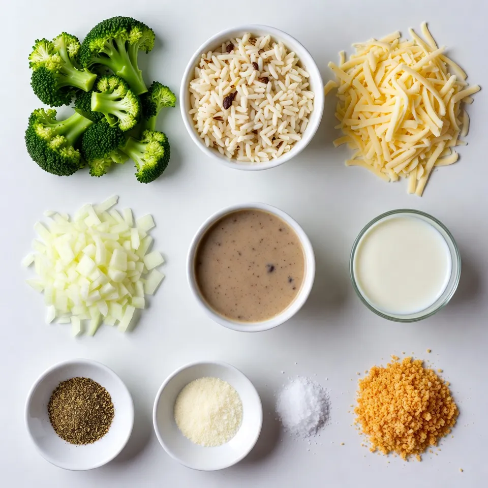 Each ingredient plays a key role. The rice serves as the base, giving the dish its hearty feel. Broccoli adds color and nutrition. Cheddar cheese brings that gooey, cheesy goodness. Cream of mushroom soup adds richness and flavor. Milk keeps the mixture moist. Onions and garlic powder enhance the taste, while black pepper and salt round it out. Finally, crispy breadcrumbs offer a nice crunch on top.