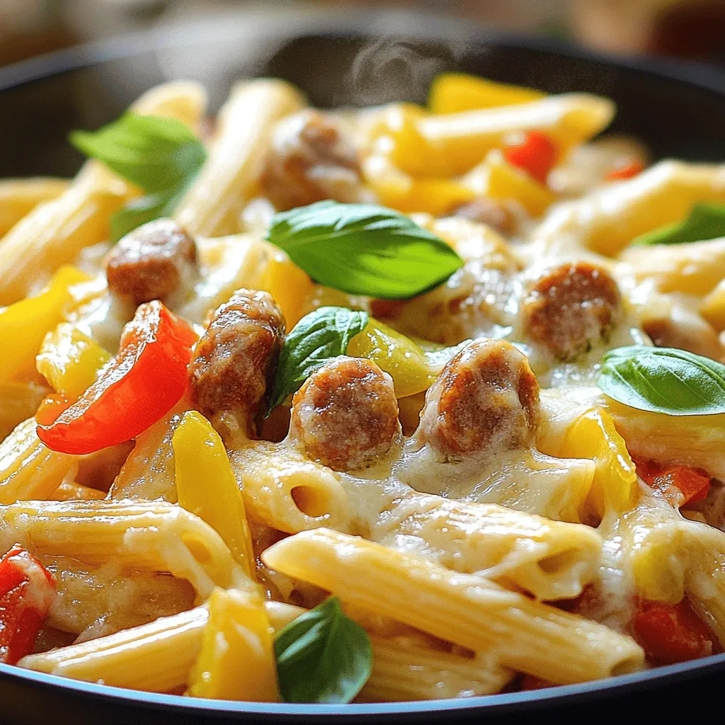 For this dish, I love using penne pasta because it holds sauce well. Italian sausage adds a rich, savory flavor. I choose a mix of bell peppers for color and sweetness. The onion and garlic bring a nice aroma and depth to the dish.