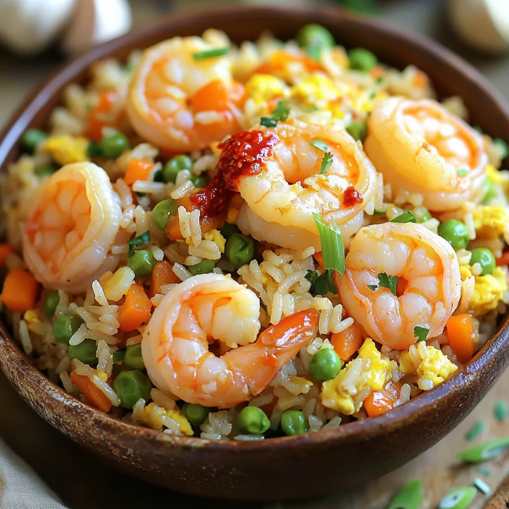 - 1 lb shrimp, peeled and deveined - 2 cups cooked jasmine rice (preferably day-old) - 4 cloves garlic, minced - 2 tablespoons chili paste (adjust to taste) - 1 tablespoon oyster sauce - 1 cup mixed vegetables (carrots, peas, corn) - 2 eggs, lightly beaten - 2 green onions, sliced - 2 tablespoons soy sauce - 3 tablespoons vegetable oil - Salt and pepper to taste When making Chili Garlic Shrimp Fried Rice, you'll need fresh shrimp. Use 1 lb of peeled and deveined shrimp for a great taste. Jasmine rice works best, so use 2 cups of cooked rice. It's ideal if the rice is day-old, as it stays fluffy. Garlic adds depth; use 4 cloves minced. For spice, include 2 tablespoons of chili paste, but adjust it based on your heat preference. You can add optional ingredients for more flavor. If you like, mix in 1 tablespoon of oyster sauce. Adding 1 cup of mixed veggies, like carrots, peas, or corn, can boost nutrition. Two lightly beaten eggs add richness, while 2 sliced green onions give freshness. For seasoning, 2 tablespoons of soy sauce brings umami. Use 3 tablespoons of vegetable oil for cooking, and season with salt and pepper to taste. This simple list of ingredients makes your meal tasty and satisfying. To make your shrimp full of flavor, mix them with chili paste and salt. Use 1 tablespoon of chili paste. Let the shrimp sit for about 10 minutes. This gives the flavors time to soak in. Using day-old rice is key. It stays fluffy and doesn’t clump together. If you use fresh rice, let it cool on a tray to separate the grains. This step helps keep the rice light and airy. First, heat 1 tablespoon of vegetable oil in a large skillet over medium-high heat. Add the marinated shrimp and cook for about 2-3 minutes. They should turn pink. Remove the shrimp and set them aside. Next, add more oil if needed, and pour in the beaten eggs. Scramble them until just set and then transfer them to a plate. After that, add the remaining oil to the skillet. Toss in the minced garlic and sauté it for about 30 seconds. Then, mix in the vegetables and cook for about 3-4 minutes until they are tender. Now, it's time to combine everything. Add the cooked rice to the skillet, breaking up any clumps. Pour in the soy sauce, oyster sauce if using, and the remaining chili paste. Stir well to mix everything. Reintroduce the shrimp and scrambled eggs back into the skillet. Season with salt and pepper. Stir-fry for about 2-3 minutes until heated through. Finally, add sliced green onions and give it one last mix. - Use day-old rice for best results. It helps keep the rice non-sticky. - If using fresh rice, spread it out on a tray to cool. This helps it fluff up. - Keep your heat at medium-high. This ensures quick cooking without burning. - Adjust the chili paste to suit your taste. More paste means more heat! - For milder flavors, try using sweet chili sauce instead of chili paste. - You can swap soy sauce for a gluten-free version. Tamari works well too. - Serve your fried rice in colorful bowls. This makes it more inviting. - Garnish with extra green onions for a fresh look. - A sprinkle of sesame seeds adds a nice crunch and visual appeal. {{image_2}} You can switch up the shrimp with different proteins. - Chicken: Use diced chicken breast instead of shrimp. Cook it until golden brown. This adds a nice twist. - Tofu: For a plant-based option, use firm tofu. Cut it into cubes and sauté until crispy. It absorbs flavors well. Not a fan of jasmine rice? Try these options. - Brown rice: This adds a nutty flavor. It takes longer to cook, so plan ahead. - Quinoa: Quinoa is a great gluten-free choice. It’s packed with protein and cooks quickly. You can make this dish fit your diet. - Using tempeh: Tempeh is a great protein source. Cube it and sauté until golden. It adds a hearty texture. - Veggie-only adaptations: Skip the shrimp and add more veggies. Use bell peppers, broccoli, or snap peas. This keeps the dish colorful and tasty. After enjoying your chili garlic shrimp fried rice, store leftovers in an airtight container. This keeps the flavors intact. Use a container that seals well to prevent air from getting in. In the fridge, your fried rice lasts about 3 to 4 days. Be sure to cool it down before placing it in the fridge. To reheat, use a skillet or a microwave. In a skillet, add a splash of water and heat over medium. Stir often to prevent sticking. In the microwave, cover the dish with a lid or a damp paper towel. This keeps moisture in and avoids sogginess. Heat in short bursts, stirring in between. You can freeze chili garlic shrimp fried rice for later. Use freezer-safe containers or bags to keep it fresh. Divide the rice into portions before freezing. This makes it easy to thaw just what you need. When you're ready to eat, thaw it in the fridge overnight or use the microwave. Can I use frozen shrimp? Yes, you can use frozen shrimp for this recipe. Just thaw them first. Place the shrimp in cold water for about 20 minutes. This helps them cook evenly. What is the best rice for fried rice? Jasmine rice works best for fried rice. It has a nice texture and flavor. Day-old rice is even better since it's drier and won't clump together. How do I make the dish spicier? To add more heat, increase the chili paste. You can also sprinkle some crushed red pepper flakes. Adjust to your taste for the right kick. Is there a gluten-free option for the soy sauce? Yes, you can use gluten-free soy sauce or tamari. Both options give the same umami flavor without gluten. Can I add other vegetables? Absolutely! Feel free to add bell peppers, broccoli, or snap peas. Mix and match to your liking for added color and nutrition. This blog covered all you need to know for cooking shrimp fried rice. We discussed key ingredients like shrimp, rice, and garlic. You learned step-by-step how to marinate shrimp and fry rice perfectly. We shared helpful tips for flavoring, presentation, and variations for the dish. In the end, shrimp fried rice is easy 
