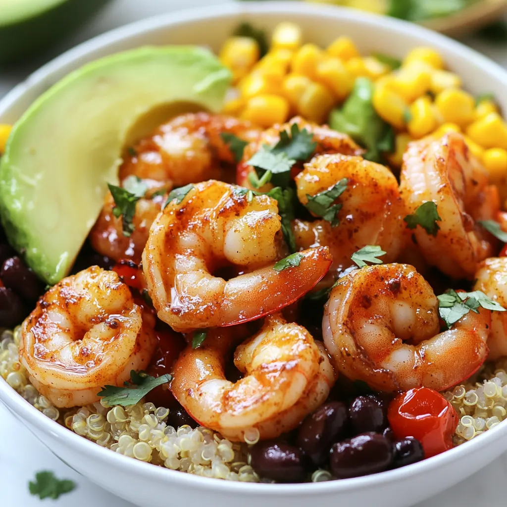 A flavorful bowl featuring marinated shrimp, quinoa, and fresh toppings.