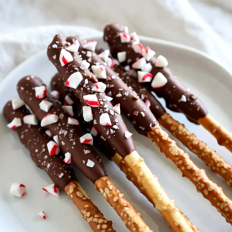 Delicious pretzel rods dipped in chocolate and sprinkled with crushed peppermint candies.