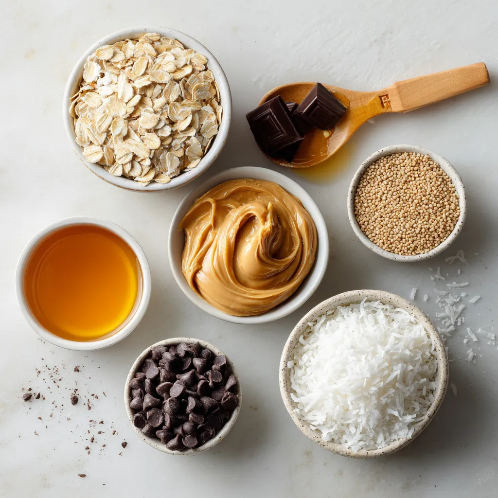 The main ingredients offer several health benefits. Rolled oats help with digestion and keep you full. Peanut butter provides protein and healthy fats. Honey or maple syrup gives quick energy. Dark chocolate contains antioxidants. Flaxseed adds fiber and nutrients.
