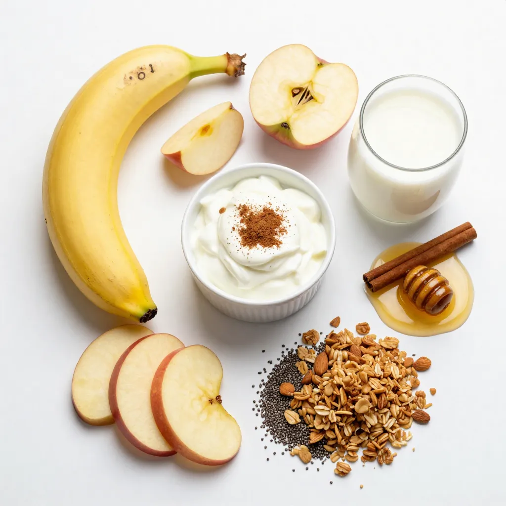 First, gather your ingredients. You need a frozen banana, a chopped apple, Greek yogurt, almond milk, and cinnamon. If you want more sweetness, add honey or maple syrup.