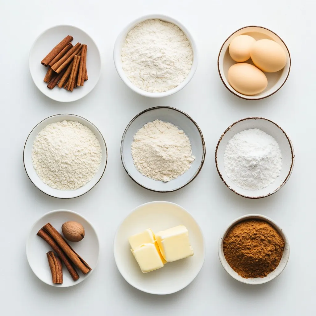 First, gather all your ingredients. You need 2 cups of all-purpose flour, 1 teaspoon of baking powder, 1/2 teaspoon of baking soda, 1/4 teaspoon of salt, and spices like 1 tablespoon of ground cinnamon and 1/2 teaspoon of nutmeg.