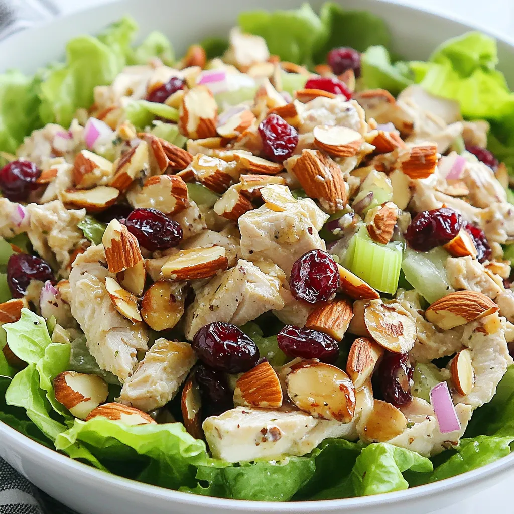 - 2 cups cooked chicken breast, diced - 1/2 cup dried cranberries - 1/3 cup sliced almonds, toasted - 1/2 cup Greek yogurt - 2 tablespoons honey - 1 tablespoon Dijon mustard - 1 tablespoon apple cider vinegar - 1/4 cup celery, diced - 1/4 cup red onion, finely chopped - Soft lettuce leaves or whole grain bread for serving When making Cranberry Almond Chicken Salad, I start with the main ingredients. You need cooked chicken breast, dried cranberries, and sliced almonds. Diced chicken gives a great base. The cranberries add a sweet touch, while the almonds add crunch. For the dressing, I use Greek yogurt, honey, Dijon mustard, and apple cider vinegar. Greek yogurt keeps it creamy and healthy. Honey adds sweetness, and Dijon mustard gives a tangy kick. Apple cider vinegar brightens the flavors. You can also add optional ingredients. Diced celery gives a nice crunch. Finely chopped red onion adds flavor. Serve the salad on soft lettuce leaves for a light meal or use whole grain bread for a sandwich. These choices make it fun and tasty! {{ingredient_image_1}} To make the chicken salad, start with the chicken breast. You need 2 cups of cooked chicken breast, diced. Cut the chicken into small, even pieces. This helps it mix well with the other ingredients. You can roast, boil, or grill the chicken. If you want juicy and tender chicken, grilling is best. Make sure to season it with salt and pepper as it cooks. Now, let’s combine the main ingredients. In a large bowl, add the diced chicken, 1/2 cup of dried cranberries, 1/3 cup of sliced almonds, 1/4 cup of diced celery, and 1/4 cup of finely chopped red onion. Stir these together gently. Next, create the dressing. In a different bowl, whisk together 1/2 cup of Greek yogurt, 2 tablespoons of honey, 1 tablespoon of Dijon mustard, and 1 tablespoon of apple cider vinegar. Whisk until it’s smooth. This will give the salad a creamy and sweet taste. Pour the yogurt dressing over the chicken mixture. Stir everything well so that all ingredients are coated nicely. Now, season with salt and pepper to taste. You can add more or less depending on what you like. Chill the salad in the refrigerator for at least 30 minutes. This lets the flavors mix. When you’re ready to serve, you can put the salad on soft lettuce leaves or use whole grain bread for a sandwich. Enjoy your tasty Cranberry Almond Chicken Salad! To boost flavor, add a pinch of garlic powder or onion powder. These spices bring out the best in your salad. Letting the salad chill for at least 30 minutes is key. This time allows the flavors to mix well. If you need alternatives, use baked tofu or chickpeas instead of chicken. For a vegan option, swap Greek yogurt with a plant-based yogurt. You can also try maple syrup instead of honey for a vegan sweetener. For a pretty presentation, serve your salad on colorful lettuce leaves. You can also make a tasty sandwich with whole grain bread. Pair it with fresh fruit or crunchy veggies for a balanced meal. Pro Tips Use Rotisserie Chicken: For a quicker option, use store-bought rotisserie chicken to save time on cooking and shredding. Toast Almonds for Extra Flavor: Toasting the almonds enhances their flavor and adds a delightful crunch to your salad. Chill for Best Flavor: Allow the salad to chill in the refrigerator for at least 30 minutes before serving to let the flavors meld together. Customize Your Ingredients: Feel free to add other ingredients like chopped apples or grapes for added sweetness and texture. {{image_2}} You can make your cranberry almond chicken salad unique by adding different fruits and veggies. - Other fruits to consider: Try adding diced apples or juicy grapes. Both add a sweet crunch. Pineapple also adds a tropical twist. - Incorporating different vegetables: You can add shredded carrots for color or diced bell peppers for crunch. Even chopped cucumber can make it refreshing. If you want to change the protein, there are many options. - Swapping chicken for other proteins: You can use turkey if you prefer. Cooked shrimp or tuna work well too. Each choice adds a different flavor. - Vegetarian or vegan protein alternatives: Use chickpeas or lentils for a plant-based option. Tofu can also replace chicken and soak up the tasty dressing. This salad is versatile and can be served in different ways. - Turning it into a wrap: Use a tortilla to make a wrap. Spread the salad inside and roll it up. It’s a great lunch option! - Serving it in a bowl or platter: You can serve it in a bowl on a bed of greens. A larger platter can work for parties, allowing guests to serve themselves. To keep your Cranberry Almond Chicken Salad fresh, place it in the fridge. Use an airtight container to avoid any odors. Make sure the container is clean and dry before you add the salad. This method helps maintain the salad's crispness and flavor. You can store the chicken salad in the fridge for up to three days. After that, the quality may drop. Look for any signs of spoilage. If you see any off smells or a change in color, it’s best to throw it away. Yes, you can freeze chicken salad, but it may change in texture. To freeze, place the salad in a freezer-safe container. Leave some space at the top because the salad will expand. When you are ready to eat it, thaw it in the fridge overnight. Avoid refreezing once it has thawed. Cranberry Almond Chicken Salad can last up to three days in the fridge. Keep it in an airtight container to keep it fresh. After three days, the flavors may fade, and the texture may change. Always check for any signs of spoilage before eating. Yes, you can make this salad ahead of time. It tastes even better after chilling for a few hours. I recommend preparing it the night before serving. Just make sure to store it in the fridge. This way, the flavors blend nicely, and you save time on the day you plan to eat it. If you don’t have Greek yogurt, you can use regular yogurt or sour cream. For a dairy-free option, try using a plant-