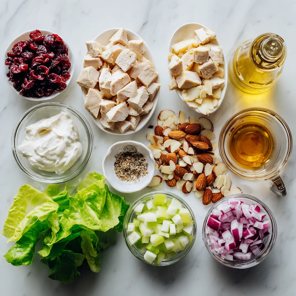 When making Cranberry Almond Chicken Salad, I start with the main ingredients. You need cooked chicken breast, dried cranberries, and sliced almonds. Diced chicken gives a great base. The cranberries add a sweet touch, while the almonds add crunch.