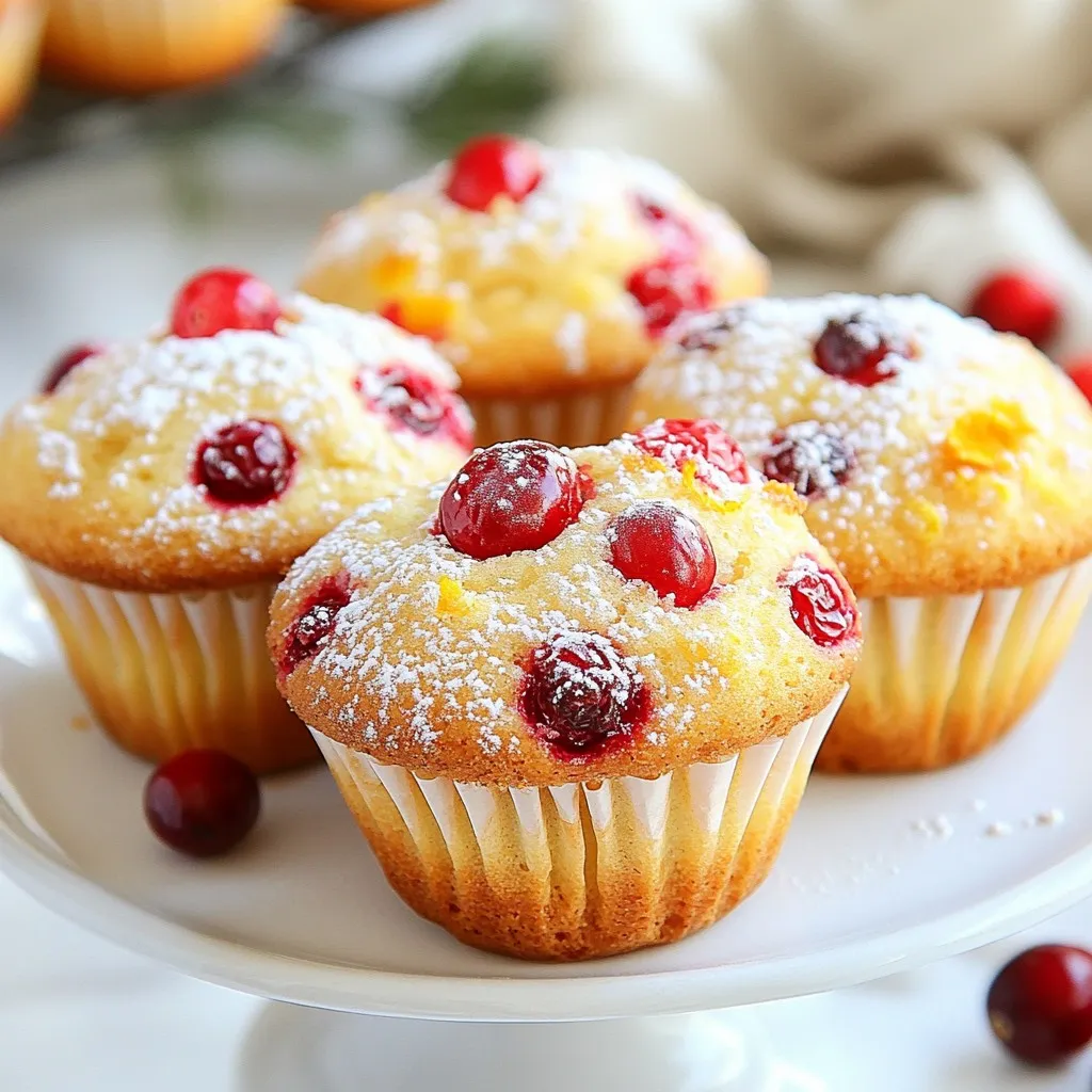 - 2 cups all-purpose flour - 1/2 cup granulated sugar - 1/2 cup brown sugar - 1 tablespoon baking powder - 1/2 teaspoon baking soda - 1/4 teaspoon salt - 1/2 teaspoon ground cinnamon I love using all-purpose flour in these muffins. It gives a nice, soft texture. The mix of granulated and brown sugars adds sweetness and depth. Baking powder and baking soda help the muffins rise perfectly. The salt and cinnamon balance the flavors well. - 1/2 cup unsalted butter, melted - 2 large eggs - 1 cup freshly squeezed orange juice - 1 teaspoon vanilla extract - Zest of 1 orange Melted butter adds richness to the muffins. Eggs help bind everything together. Freshly squeezed orange juice is key for that bright flavor. Vanilla extract elevates the taste, while the zest adds a punch of citrus aroma. - 1 cup fresh cranberries, chopped - 1/2 cup walnuts (optional) Fresh cranberries bring tartness that contrasts with the sweetness. They also add vibrant color. If you like, toss in walnuts for extra crunch and flavor. They complement the cranberries nicely, but you can skip them if you prefer. {{ingredient_image_1}} Start by preheating your oven to 375°F (190°C). This step is key to getting those muffins fluffy and golden. While the oven warms up, line your muffin tin with paper liners or grease it lightly with butter. This makes it easy to remove the muffins later. In a large bowl, combine 2 cups of all-purpose flour, 1/2 cup of granulated sugar, and 1/2 cup of brown sugar. Add in 1 tablespoon of baking powder, 1/2 teaspoon of baking soda, 1/4 teaspoon of salt, and 1/2 teaspoon of ground cinnamon. Whisk these ingredients together well. This mix gives your muffins a nice rise and flavor. In a separate bowl, melt 1/2 cup of unsalted butter. Let it cool a bit before adding 2 large eggs, 1 cup of freshly squeezed orange juice, 1 teaspoon of vanilla extract, and the zest of 1 orange. Mix everything until it's smooth. This will add moisture and a lovely citrus taste. Pour the wet mix into the dry mix, stirring gently until just combined. Do not overmix; a few lumps are okay. Next, fold in 1 cup of chopped fresh cranberries and 1/2 cup of walnuts if you like. Now, divide the batter evenly among the 12 muffin cups, filling each about 2/3 full. Bake for 18-22 minutes. To check if they are done, insert a toothpick into the center of a muffin. If it comes out clean, they are ready! Let the muffins cool in the tin for 5 minutes, then transfer them to a wire rack. Enjoy your tasty breakfast delight! To get the best muffins, avoid overmixing the batter. Mix just until you see no dry flour. Some lumps are okay. If you mix too much, the muffins may turn out tough. When filling muffin cups, fill each about two-thirds full. This gives them room to rise without spilling over. If you overfill, you’ll end up with a messy muffin top. For extra flavor, consider adding spices like ginger or nutmeg. These spices pair well with the tartness of cranberries. You can also try adding a pinch of cardamom for a unique twist. Using fresh cranberries makes a big difference in taste. They are juicy and bright. Frozen cranberries work too, but they may be a bit softer. If using frozen, keep them slightly frozen before adding them to the batter. This helps them hold their shape while baking. Serve your muffins warm for the best experience. A dusting of powdered sugar adds a sweet touch. For a fun twist, make an orange glaze. Mix powdered sugar with a splash of orange juice. Drizzle it over the muffins for a zesty finish. This extra step makes your muffins look and taste gourmet! Pro Tips Use Fresh Ingredients: For the best flavor, opt for fresh cranberries and freshly squeezed orange juice. This will enhance the overall taste of your muffins. Don’t Overmix: When combining wet and dry ingredients, mix just until combined. Overmixing can lead to dense muffins rather than light and fluffy ones. Customize Your Add-ins: Feel free to substitute the walnuts with other nuts or even chocolate chips for a different flavor profile! Check for Doneness: To ensure your muffins are perfectly baked, insert a toothpick into the center; it should come out clean or with a few moist crumbs. {{image_2}} You can easily swap flour for gluten-free options. Try almond flour or a gluten-free blend. This keeps the texture nice and fluffy. For sweeteners, consider using honey or maple syrup. They add a different flavor while keeping it sweet. Adjust the amount since these can be sweeter than sugar. Mix things up by adding other fruits. Blueberries or raspberries work well with cranberries. They add a nice twist and more color. You can also stir in chocolate chips for a rich taste. Another fun idea is to add more citrus zest. Combining lemon and orange zest boosts the fresh flavor. If you want to make vegan muffins, replace eggs with flaxseed meal or applesauce. Both options work well in baked goods. You can also use plant-based butter instead of regular butter. For those with nut allergies, just skip the walnuts. Your muffins will still be tasty and full of flavor. To keep your cranberry orange muffins fresh, follow these tips: - Cool them completely: Allow muffins to cool on a wire rack. This prevents moisture from building up. - Use an airtight container: Place muffins in a container that seals tightly. This keeps them soft. - Keep at room temperature: Store them in a cool, dry place. They stay fresh for up to three days. For longer shelf life, consider adding a paper towel inside the container. This absorbs extra moisture and keeps muffins from getting soggy. You can freeze your muffins to enjoy later. Here’s how: - Wrap each muffin: Use plastic wrap to cover each muffin tightly. This helps prevent freezer burn. - Place in a freezer bag: Put the wrapped muffins into a freezer-safe bag. Remove as much air as possible. - Label and date: Write the date on the bag. This helps you remember when you froze them. To thaw, take a muffin out of the freezer. Leave it a
