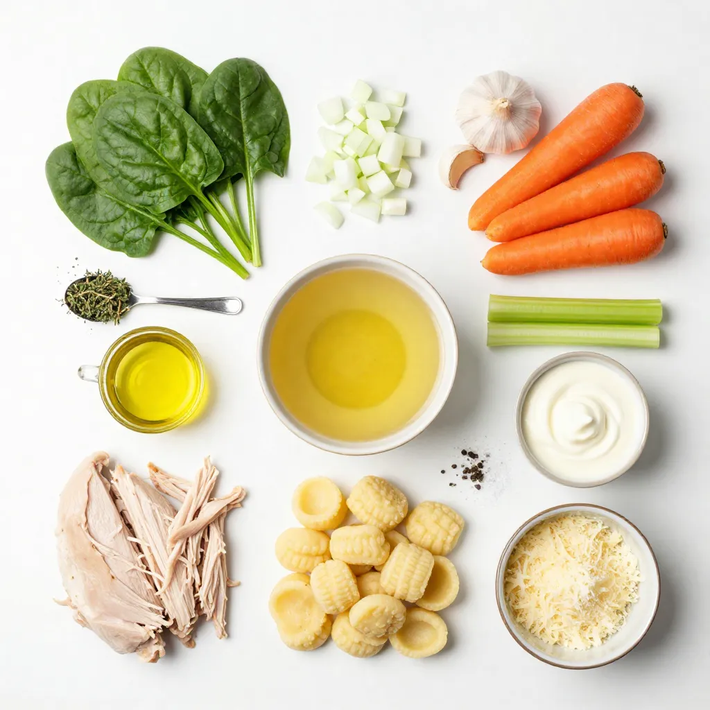 First, gather your ingredients. You will need olive oil, onion, garlic, carrots, celery, thyme, oregano, chicken broth, cooked chicken, gnocchi, heavy cream, spinach, salt, pepper, and Parmesan cheese. Dice the onion, carrots, and celery. Mince the garlic. This prep makes cooking smooth and fast.