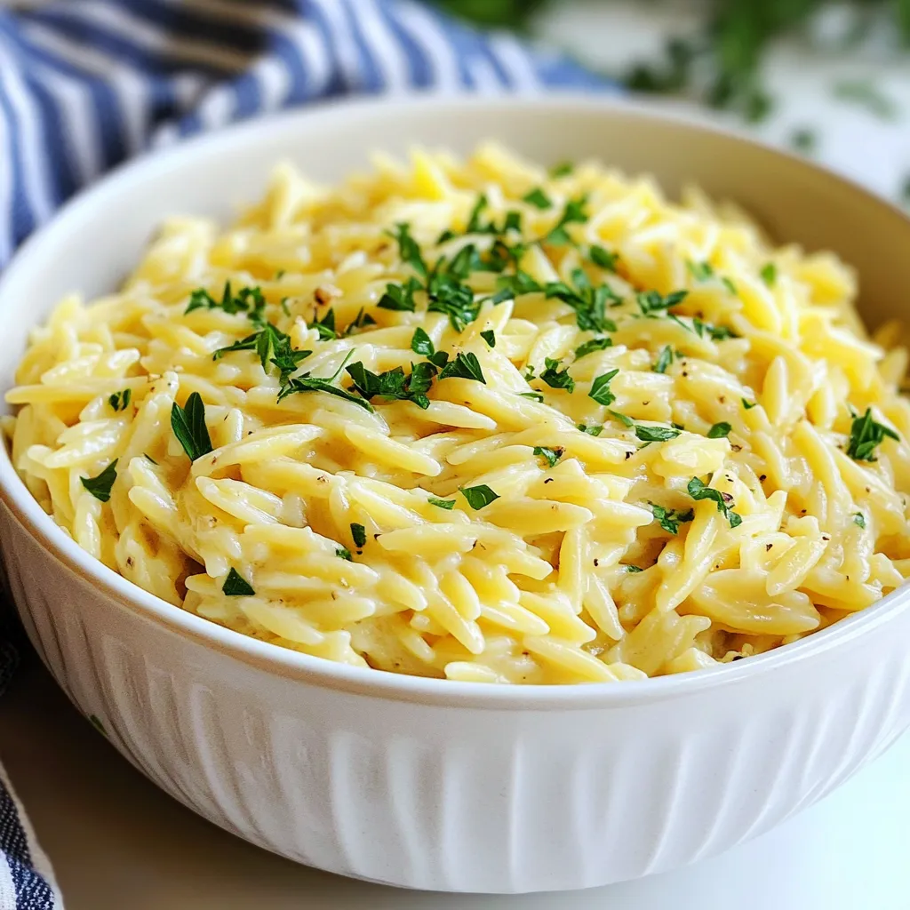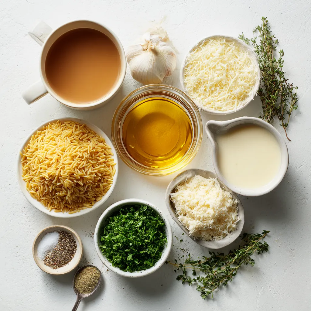 Gathering the right ingredients makes cooking easy and fun. For this creamy garlic Parmesan orzo, you need simple items. You start with orzo pasta, which cooks quickly and absorbs flavors well. The olive oil adds richness to the dish, while the garlic gives it a tasty kick. Always use fresh garlic for the best flavor.