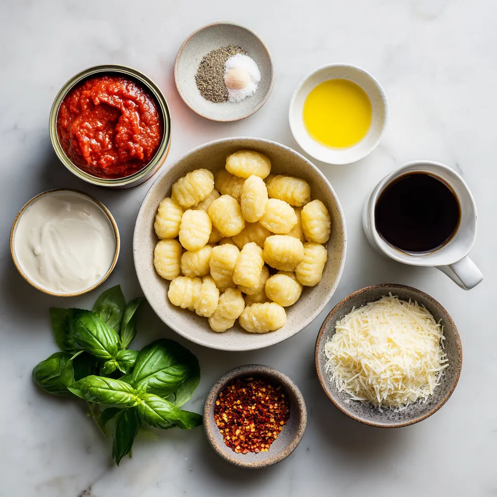 To make creamy tomato basil gnocchi, you need simple yet flavorful ingredients. The main ingredient is potato gnocchi, which gives a soft and delightful bite. The olive oil adds richness, while garlic brings a warm, savory touch.