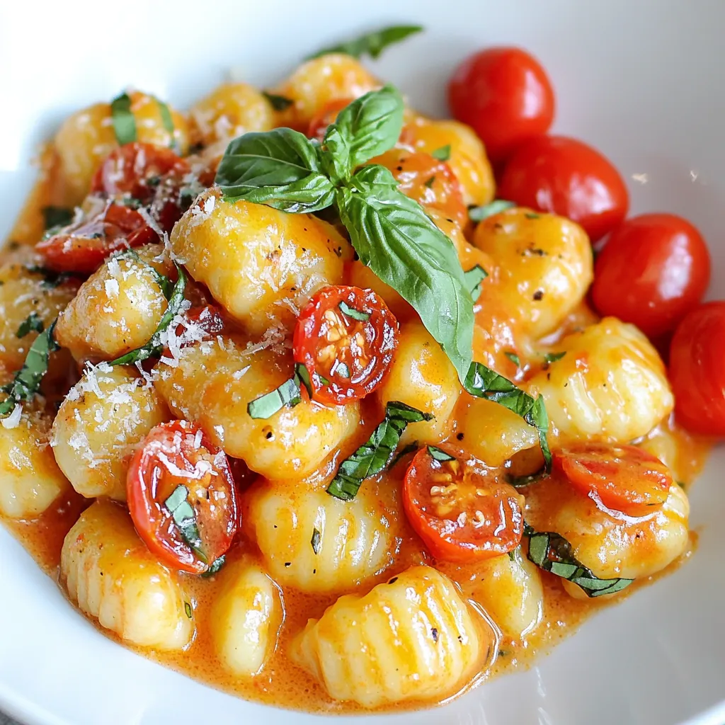 A delicious and creamy gnocchi dish with tomatoes and fresh basil.