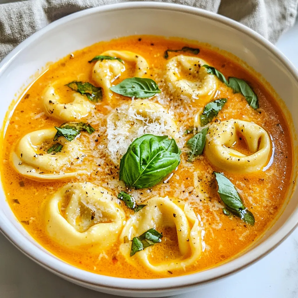 A rich and comforting soup made with cheese tortellini, crushed tomatoes, and fresh basil.