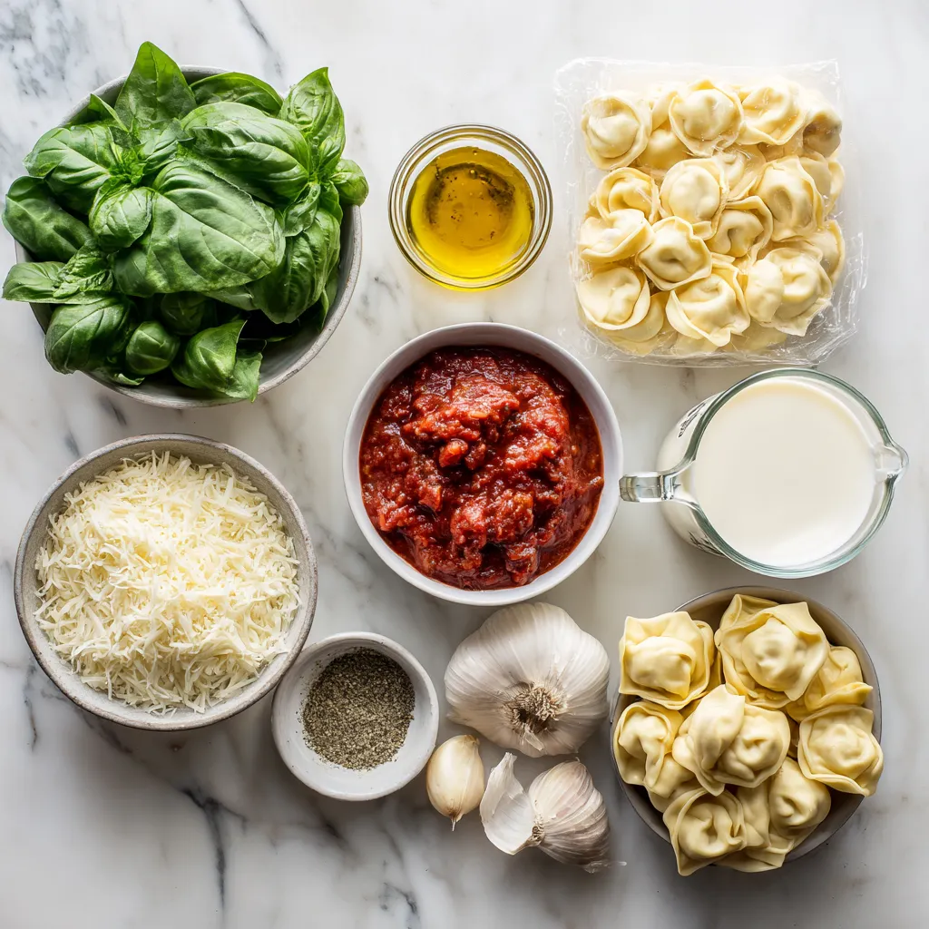 β Get your cheese tortellini, heavy cream, and fresh basil leaves.