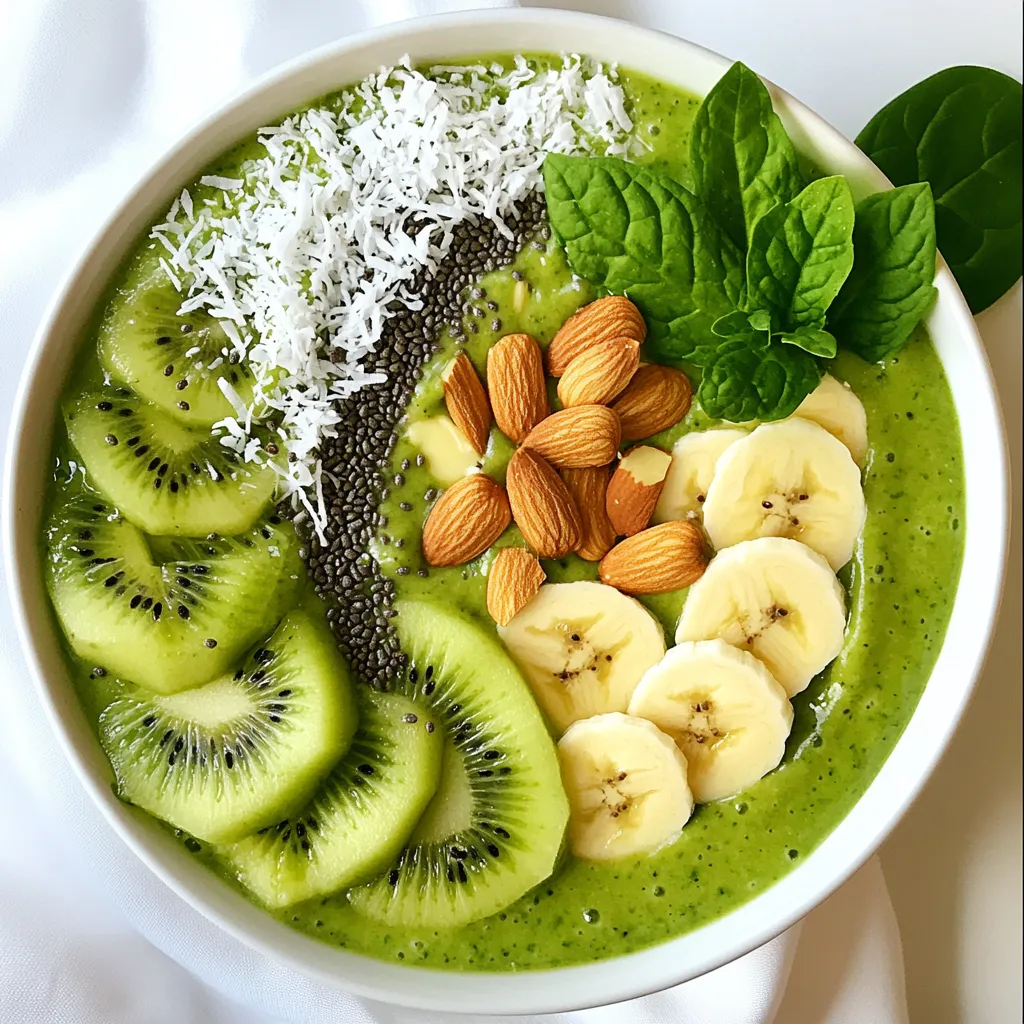 A refreshing and nutritious green smoothie bowl packed with spinach, banana, and avocado, topped with fresh fruits and seeds.