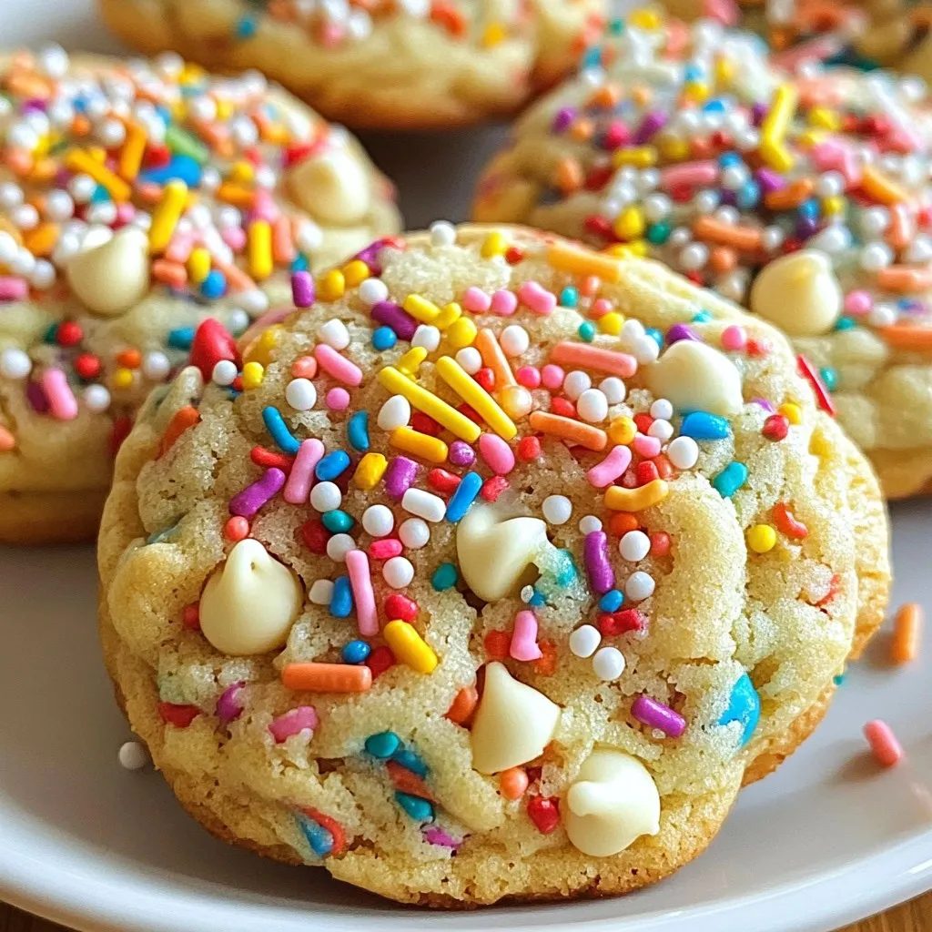 To make Funfetti Birthday Cake Cookies, you need: - 1 cup unsalted butter, softened - 1 cup granulated sugar - 1 cup packed brown sugar - 2 large eggs - 1 teaspoon vanilla extract - 3 cups all-purpose flour - 1 teaspoon baking soda - 1/2 teaspoon salt - 1 cup rainbow sprinkles (plus extra for topping) - 1/2 cup white chocolate chips You can swap unsalted butter for coconut oil or margarine. Use brown sugar for a richer taste. If you want a lighter cookie, try using half granulated sugar and half raw sugar. For eggs, you can use flax eggs or applesauce as a vegan option. If you want to make gluten-free cookies, use a gluten-free flour blend. Always use fresh ingredients for the best flavor. Choose unsalted butter for better control over salt levels. Fresh eggs give better texture and taste. Look for high-quality vanilla extract, as it adds depth. For sprinkles, pick a brand that uses natural colors. Quality white chocolate chips help enhance the sweetness and creaminess. {{ingredient_image_1}} First, turn your oven to 350Β°F (175Β°C). I like to use parchment paper to line my baking sheet. This helps the cookies not stick. You want to make sure the oven is ready before you start mixing. In a large bowl, add 1 cup of softened butter, 1 cup of granulated sugar, and 1 cup of brown sugar. Mix these together until they are light and fluffy. This should take about 2-3 minutes. Next, crack in 2 large eggs, adding them one at a time. Mix well after each egg. Finally, pour in 1 teaspoon of vanilla extract and mix until everything is smooth. Grab another bowl for the dry ingredients. Whisk together 3 cups of all-purpose flour, 1 teaspoon of baking soda, and 1/2 teaspoon of salt. Slowly add this dry mixture to the wet mixture. Mix until just combined; don’t overmix! Now, fold in 1 cup of rainbow sprinkles and 1/2 cup of white chocolate chips. This adds fun color and sweetness to your cookies. To get the best cookie texture, start with softened butter. This helps the dough mix well. Cream the butter and sugars until it looks light and fluffy. This step is key! Use room temperature eggs. They blend better into the dough. When mixing, don’t overdo it after adding the flour. Just mix until you see no dry spots. This keeps your cookies soft and chewy. To keep your cookies fresh, store them in an airtight container. This blocks air and moisture. Place a slice of bread in the container. It helps maintain moisture and softness. For longer storage, freeze them. Wrap each cookie in plastic wrap and place in a freezer bag. They can stay fresh for up to three months! If your cookies spread too much, check your butter temperature. It should be soft, not melted. If they are too hard, you may have baked them too long. Keep an eye on them in the oven. If your cookies are too dry, try adding a bit more butter. A little extra can fix dry cookies. Remember, baking is an art! Don't be afraid to experiment a bit. Pro Tips Use Room Temperature Ingredients: Ensure that your butter and eggs are at room temperature for better incorporation and a fluffier cookie texture. Chill the Dough: For thicker cookies, chill the dough for at least 30 minutes before baking. This helps prevent spreading and results in a chewier cookie. Don’t Overbake: Keep an eye on your cookies as they bake. They should be lightly golden around the edges while remaining soft in the center. Customize Sprinkles: Experiment with different types of sprinkles to match the occasion, such as holiday-themed or pastel sprinkles for a softer look. {{image_2}} You can change the flavor of Funfetti cookies easily. Instead of vanilla extract, try almond extract. It adds a nice twist. You could also use lemon zest for a citrus kick. This makes the cookies taste fresh and bright. For chocolate lovers, adding cocoa powder can make a chocolate version. Swap out some flour for cocoa to keep the texture. Want to make your cookies even more fun? Add in chocolate chips or nuts. Dark chocolate chips bring a rich taste. You can also mix in peanut butter chips for a nutty flavor. Chopped nuts like walnuts or pecans add a nice crunch. Don't forget to add more rainbow sprinkles! A burst of color makes them cheerful. You can still enjoy these cookies if you have diet restrictions. For a gluten-free version, swap all-purpose flour with a gluten-free blend. Make sure the blend has a good mix of starches. For a vegan version, use dairy-free butter and a flax egg. Mix one tablespoon of ground flaxseed with three tablespoons of water. Let it sit for a few minutes to thicken. These swaps keep the cookies tasty and fun for everyone! When you enjoy Funfetti birthday cake cookies, think about the drinks that match well. Milk is a classic choice. It balances the sweetness and creaminess of the cookies. If you want something warm, a hot cocoa adds a cozy touch. For a fun twist, try a fruity punch. The flavors of the punch can brighten up the colorful sprinkles in the cookies. Presentation makes your cookies even more special. Start by stacking the cookies on a pretty plate. Add a colorful tablecloth for a festive look. You can use clear treat bags tied with ribbons for gifting. This gives a fun and thoughtful touch. Don't forget to sprinkle some extra rainbow sprinkles on top for a pop of color. A small sign saying "Happy Birthday!" can make it extra special too. These cookies shine at birthday parties, of course. They bring joy to kids and adults alike. However, they also work well for other events. Think about holiday gatherings or family reunions. School parties are another great time to share these treats. You can even make them for a casual get-together with friends. Their fun colors and sweet taste will delight everyone, no matter the occasion! You will know the cookies are done when the edges turn a light golden color. The centers should still look soft and a bit puffy. They will continue to cook on the baking sheet after you take them out. This usually takes about 10 to 12 