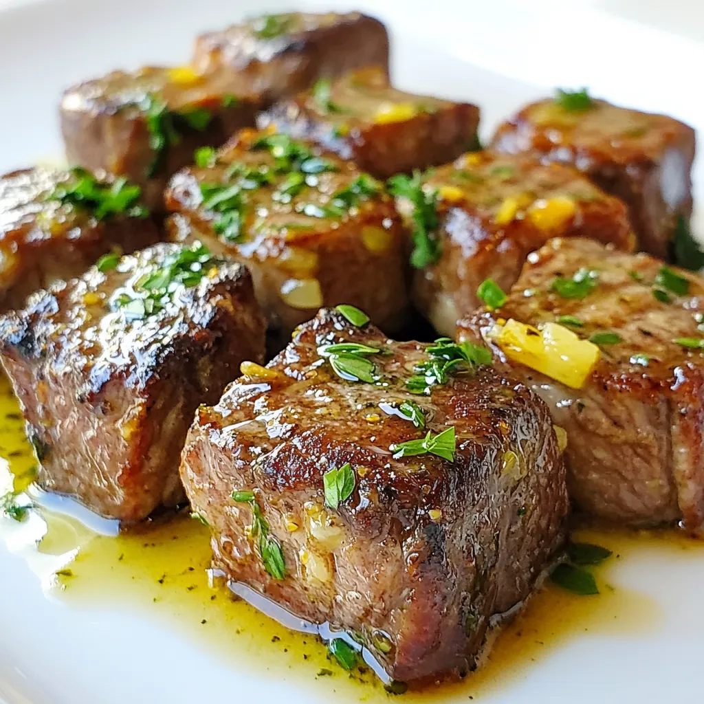 Deliciously seared steak cubes coated in a rich garlic butter sauce, perfect for a quick meal or appetizer.