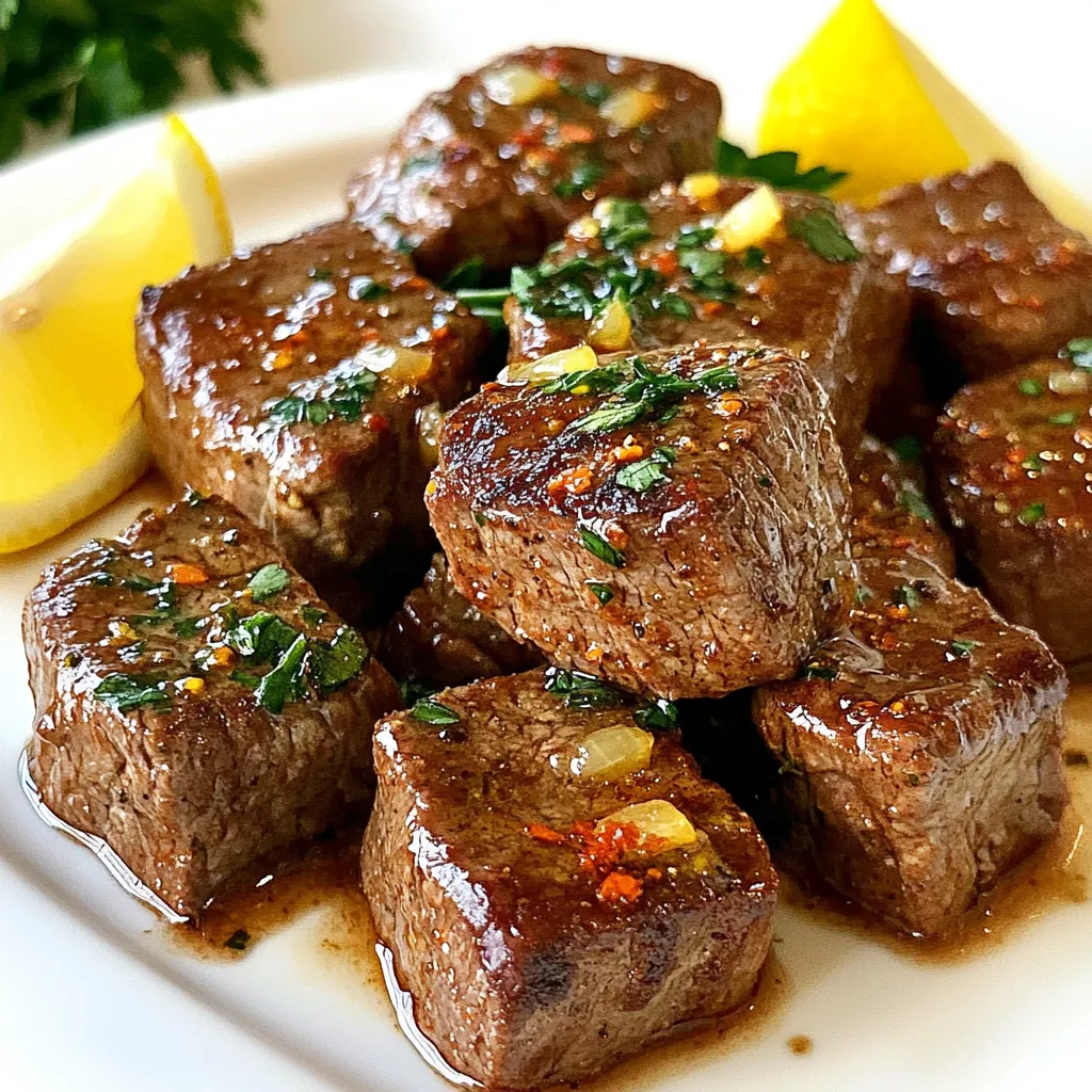 Serve the steak bites on a wooden board or a stylish platter. Arrange lemon wedges around the dish and sprinkle additional fresh parsley for color.