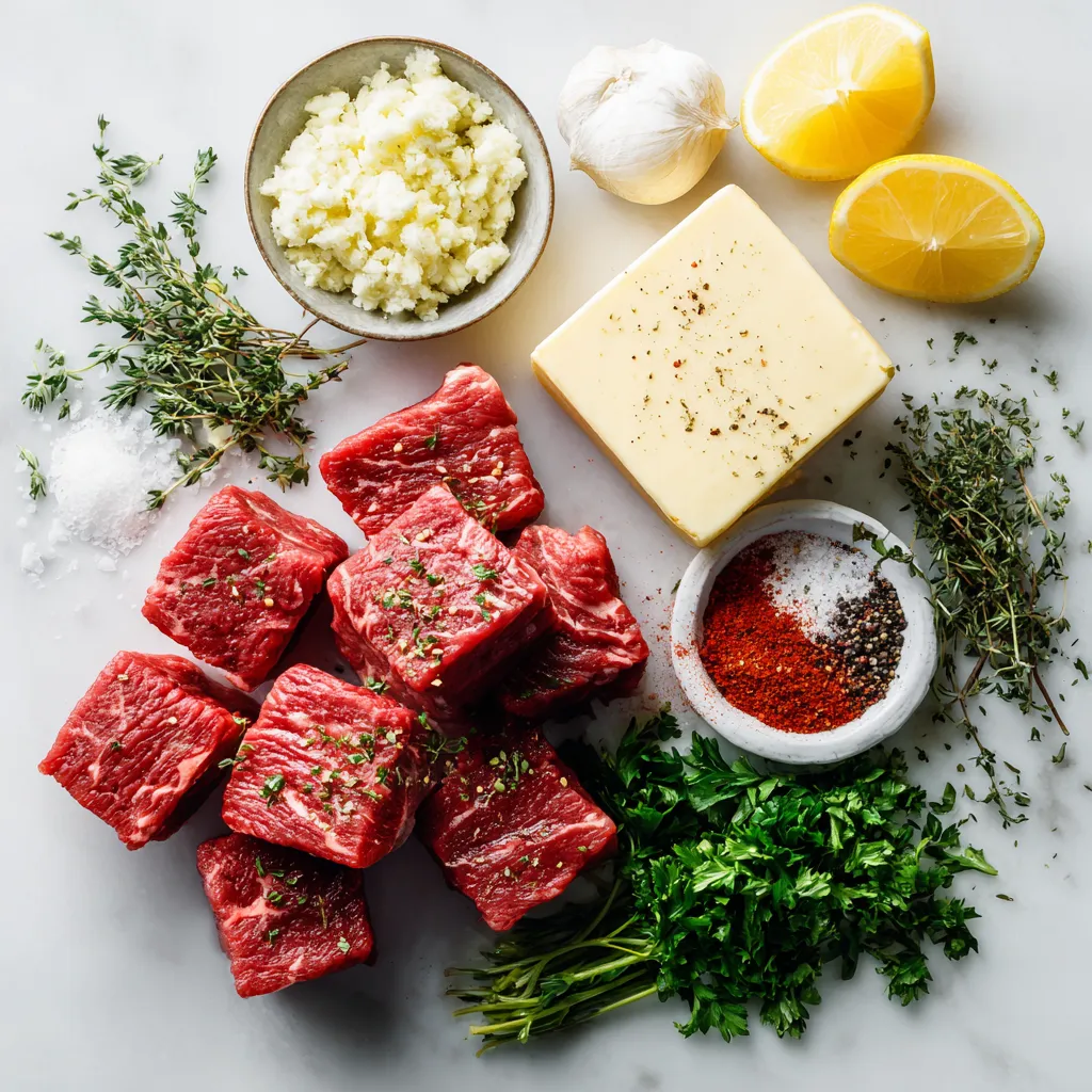 For this dish, I love using sirloin steak. It has great flavor and tenderness. Cut it into one-inch cubes for the best bite-sized pieces. Next, I add unsalted butter, which gives this dish its rich taste. Fresh garlic adds a punch, and I prefer using four cloves. It makes the garlic flavor stand out. Lastly, I use fresh thyme for a lovely herbal note. Dried thyme works too, but fresh is best.