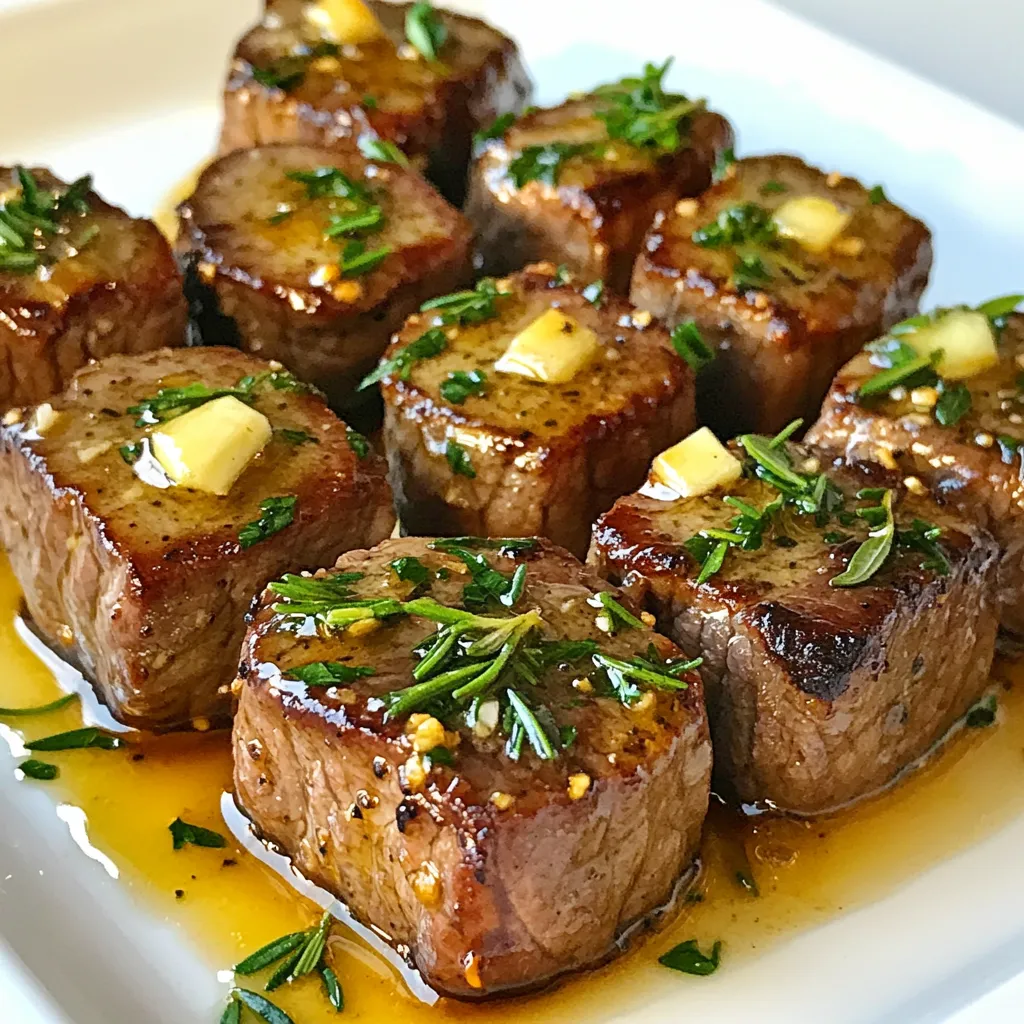 - 1 pound sirloin steak, cut into 1-inch cubes - 4 tablespoons unsalted butter - 4 cloves garlic, minced - 1 teaspoon fresh rosemary, chopped (or ½ teaspoon dried) - 1 teaspoon fresh thyme, chopped (or ½ teaspoon dried) Sirloin steak is my choice for this dish. It has great flavor and tenderness. Cut it into 1-inch cubes. This size cooks quickly and stays juicy. Next, we need unsalted butter. It adds richness and allows the garlic to shine. Speaking of garlic, use four cloves and mince them finely. Fresh herbs like rosemary and thyme add depth. They bring a nice aroma to the steak bites. - Salt and pepper to taste - 1 tablespoon olive oil - Fresh parsley, chopped (for garnish) Salt and pepper are key for flavor. Season the steak cubes well before cooking. I also use olive oil to help sear the steak. This oil has a high smoke point, perfect for high heat. Finally, fresh parsley adds a pop of color and freshness. Sprinkle it on top before serving. This simple garnish makes the dish look stunning. {{ingredient_image_1}} - Seasoning the steak cubes: Start by cutting your sirloin steak into 1-inch cubes. In a bowl, sprinkle salt and pepper over the cubes. Make sure to coat all sides evenly. This step is key for flavor. - Allowing the steak to rest: Let the seasoned steak sit at room temperature for about 15-20 minutes. This helps the flavors mix and makes the steak more tender. - Heating the skillet: Grab a large skillet and add one tablespoon of olive oil. Heat it over medium-high heat until it shimmers. Do not let it smoke. This helps create a perfect sear. - Cooking time for desired doneness: Add the steak cubes to the skillet in a single layer. Cook them for about 2-3 minutes on each side for medium-rare. Adjust the time for your preferred doneness. Remove the steak from the skillet and set it aside on a plate. - Melting the butter: In the same skillet, lower the heat to medium. Add four tablespoons of unsalted butter. Let it melt slowly. Use a spoon to scrape up any tasty bits stuck to the bottom. - Adding garlic and herbs: Once the butter is melted, add four minced garlic cloves, one teaspoon of chopped rosemary, and one teaspoon of chopped thyme. Sauté them for 1-2 minutes until fragrant. Be careful not to burn the garlic, as it can turn bitter. - Tossing steak bites in the garlic butter: Return the cooked steak bites to the skillet. Toss them in the garlic butter until they are well-coated. Cook for an additional minute to heat them through. - Garnishing before serving: Remove the skillet from heat. Sprinkle fresh chopped parsley on top for a pop of color and flavor. Serve the steak bites hot for the best taste. To get your steak just right, use a meat thermometer. Insert it into the thickest part of the steak. Aim for 130°F for medium-rare. If you prefer it more done, cook until it reaches 140°F for medium. Everyone has their own taste, so adjust your cooking time based on your preference. Add a splash of lemon juice to your garlic butter. This brightens the flavors and adds a fresh kick. You can also experiment with herbs or spices. Try adding basil, oregano, or even a dash of smoked paprika. Each option gives the dish a new twist. Use a heavy skillet, like cast iron, for cooking steak. It holds heat well and cooks the meat evenly. A good spatula is key, too. It helps you flip the steak bites without tearing them apart. This makes for a better presentation on your plate. Pro Tips Rest Your Meat: Allow the steak cubes to sit at room temperature before cooking. This helps them cook more evenly and results in a better texture. Don’t Overcrowd the Pan: Cook the steak bites in batches if necessary. Overcrowding can cause steaming instead of searing, leading to less flavorful results. Use a Meat Thermometer: To ensure the perfect doneness, use a meat thermometer. For medium-rare, aim for an internal temperature of 130-135°F (54-57°C). Fresh Herbs Matter: Use fresh herbs whenever possible for the best flavor. Dried herbs can be used in a pinch, but fresh will elevate the dish significantly. {{image_2}} You can change the steak cut for this dish. Flank or ribeye works well too. Each cut brings its own flavor and texture. Ghee is a great swap for butter. It adds a nutty taste. Plus, ghee has a high smoke point, which is perfect for cooking. You can grill your steak bites instead of pan-searing. Grilling gives a smoky flavor that is hard to beat. If you prefer a hands-off method, try oven-baking. Preheat your oven to 400°F. Place the steak bites on a baking sheet, drizzle with oil, and bake for about 10-15 minutes. For a twist, try an Asian-inspired garlic butter. Add soy sauce for rich umami. You can also add chili flakes to spice things up. This gives your bites a kick that complements the garlic perfectly. Adjust the amount to match your taste. To store leftovers, let the steak bites cool completely. Place them in an airtight container. They stay fresh for up to three days in the fridge. When reheating, use a skillet over low heat. This helps keep the steak tender. You can also microwave them, but watch the time. Heat in short bursts to avoid overcooking. To freeze steak bites, let them cool first. Arrange them in a single layer on a baking sheet. Freeze for about an hour, then transfer to a freezer bag. This prevents them from sticking together. They can last up to three months in the freezer. When you are ready to eat, thaw them in the fridge overnight. For reheating, use a skillet or oven. This ensures they heat evenly. If using the microwave, cover them to retain moisture. Enjoy your flavorful steak bites any time! Yes, you can! Here are some great choices: - Ribeye steak: This cut is rich and tender. - Filet mignon: Known for its softness and flavor. - Flank steak: A lean cut that works well when sliced thin. - Skirt steak: This cut is flavorful and great for quick cooking. Using different cuts will change the taste and texture. Always choose a cut that you enjoy! To add som