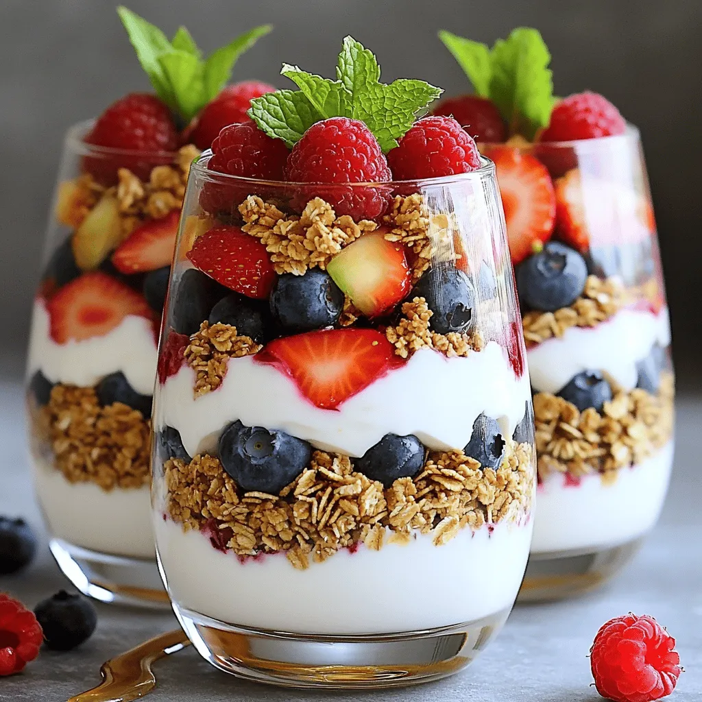 Layering is key for a great parfait. Start with yogurt at the bottom. This helps keep everything in place. Use the same amount of each layer for balance. I like to use about 1/4 cup for yogurt and berries. Gently sprinkle the granola on top of the yogurt to avoid sogginess. After each layer, press down lightly to help it stick. Finish with yogurt and top it off with granola and berries for a pretty look.