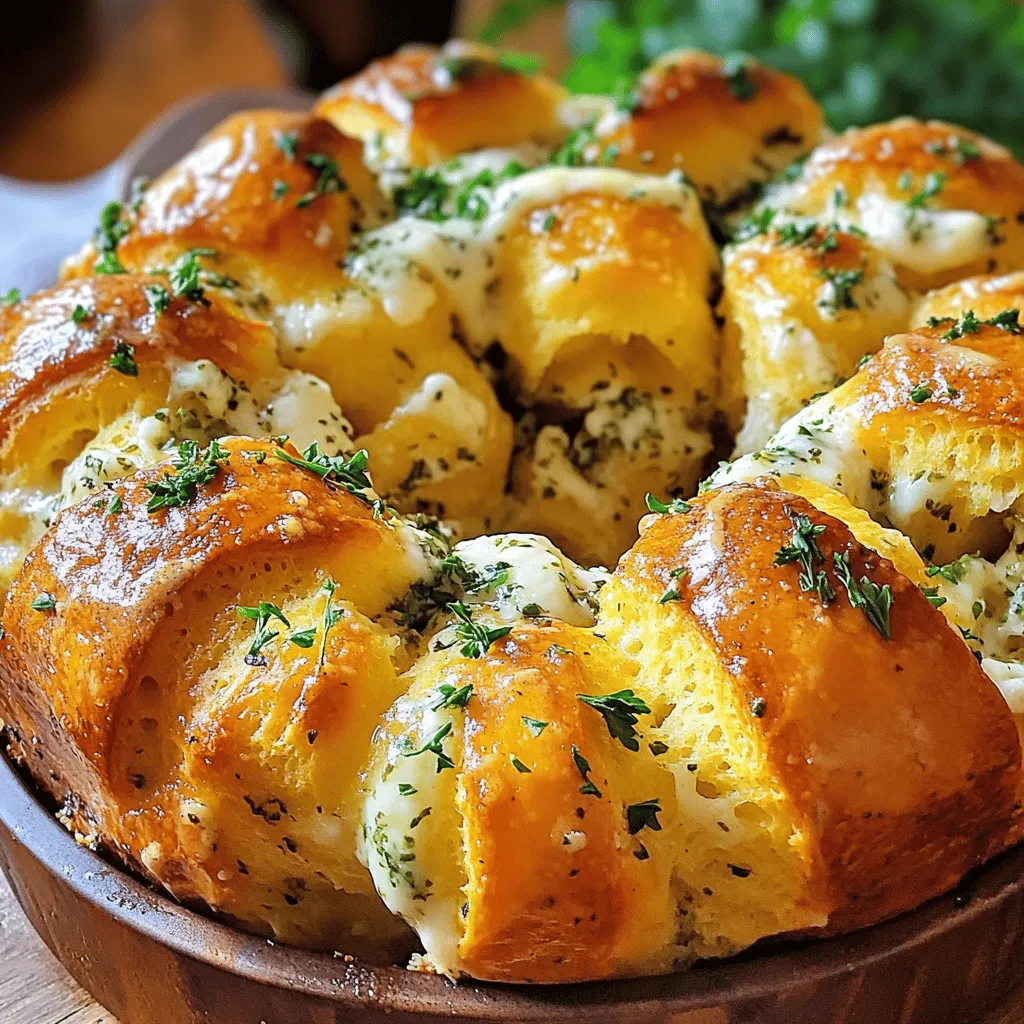 - 2 cans of refrigerated biscuit dough (16 oz each) - 1/2 cup unsalted butter, melted - 4 cloves garlic, minced - 2 teaspoons Italian seasoning - 1 teaspoon dried thyme - 1 teaspoon dried oregano - 1/4 cup fresh parsley, chopped - 1 cup shredded mozzarella cheese - Salt and pepper to taste You can find refrigerated biscuit dough in the store. If you want, you can use homemade dough. Just make sure it’s soft. For the butter, you can swap unsalted for salted. This change can add a different taste. Garlic is key here, but you can use garlic powder if needed. Want to spice things up? Add some red pepper flakes for heat. You can also mix in cooked bacon bits for a savory twist. If you love cheese, try adding parmesan or cheddar to the mix. These extras can really make the dish stand out. First, you need to preheat your oven to 350°F (175°C). Next, grab a bundt pan and grease it with cooking spray or butter. This step helps the monkey bread come out easily. In a small bowl, mix the melted butter, minced garlic, Italian seasoning, dried thyme, and oregano. Add a pinch of salt and pepper for flavor. Make sure to mix it well. Now, open your cans of refrigerated biscuit dough. Separate each biscuit and cut them into quarters. Place the biscuit pieces in a large bowl. Pour half of the garlic herb butter mixture over them. Toss the pieces gently to coat them well. Layer half of the coated biscuit pieces at the bottom of the prepared bundt pan. After this, sprinkle half of the shredded mozzarella cheese over the biscuit layer. Next, pour half of the remaining garlic herb butter mixture over the cheese. Now, add the rest of the biscuit pieces on top. Follow this with the remaining mozzarella cheese. Finally, pour the rest of the garlic herb butter mixture over everything. To finish, sprinkle the chopped parsley on top for a fresh touch. It’s time to bake! Place the bundt pan in your preheated oven. Bake for 25 to 30 minutes. Look for a golden brown color on top, which means it’s done. Once baked, let it cool for about 5 minutes. Carefully invert the bundt pan onto a serving platter to release the monkey bread. Now you can pull apart the warm, cheesy pieces and enjoy! To get that nice golden brown look, bake at 350°F (175°C) for 25 to 30 minutes. Check the bread halfway through. If it's browning too fast, cover it lightly with foil. This step helps keep the heat even. The bread should be firm and not doughy inside. The key is to let it cool for five minutes after baking. This makes it easier to remove from the bundt pan. If you have leftovers, let the bread cool completely. Wrap it well in plastic wrap or foil. You can store it in the fridge for three to four days. For longer storage, freeze it. Just slice it and put it in a freezer bag. This way, it stays fresh for up to three months. When you want to eat it, thaw it in the fridge overnight. This monkey bread is great on its own, but it shines with dips. Try serving it with marinara sauce or garlic butter. A side salad adds a nice touch too. You can even serve it as an appetizer for parties. Just pull apart the pieces and enjoy! {{image_2}} You can add more cheese for a cheesy herb monkey bread. Use sharp cheddar or a blend of your favorites. Mix shredded cheese with the biscuit pieces. It makes each bite gooey and tasty. You can layer cheese between the biscuit pieces too. This gives you a great cheesy pull when you serve it. For a spicy kick, add red pepper flakes or diced jalapeños to the garlic mix. This brings heat and flavor to the bread. You can also use spicy oil instead of butter for added zest. This version pairs well with creamy dips. It’s a great option for those who like bold flavors. You can twist this recipe into a sweet treat! Use cinnamon and sugar instead of herbs. Melt butter and mix it with brown sugar for a glaze. You can add chocolate chips or dried fruit for extra sweetness. Serve it warm with a drizzle of icing for a fun dessert. You can store leftover monkey bread in the fridge. Place it in an airtight container. This keeps it fresh for about 3 days. When you are ready to eat, simply take it out and enjoy. If you want to save some for later, freezing is a great choice. Wrap individual pieces in plastic wrap. Then, place them in a freezer bag. This way, you can keep them for up to 2 months. When you crave it again, just thaw in the fridge overnight. To reheat, use your oven for the best results. Preheat your oven to 350°F. Wrap the monkey bread in foil. Heat for about 10-15 minutes until it's warm. You can also use a microwave, but it may get a bit soggy. Enjoy it warm for the best flavor! Yes, you can use homemade biscuit dough. Just make sure it is soft and easy to shape. Homemade dough adds a fresh taste. It might take longer to bake, so check for doneness. Herb Garlic Monkey Bread lasts about 2-3 days in the fridge. Store it in an airtight container. If you want it to last longer, freeze it. Just make sure it cools first. Yes, you can prep the monkey bread ahead of time. You can assemble it and chill it in the fridge. Just bake it when you are ready. This saves time and is great for gatherings. This blog post covered how to make delicious monkey bread. We explored key ingredients, measurements, and fun variations. I shared easy steps for preparation, assembly, and baking. Tips on storage and serving added extra value. You can make this recipe your own by trying different flavors. Remember, whether you choose sweet or savory, monkey bread is sure to please. Enjoy your baking adventure and share it with others!