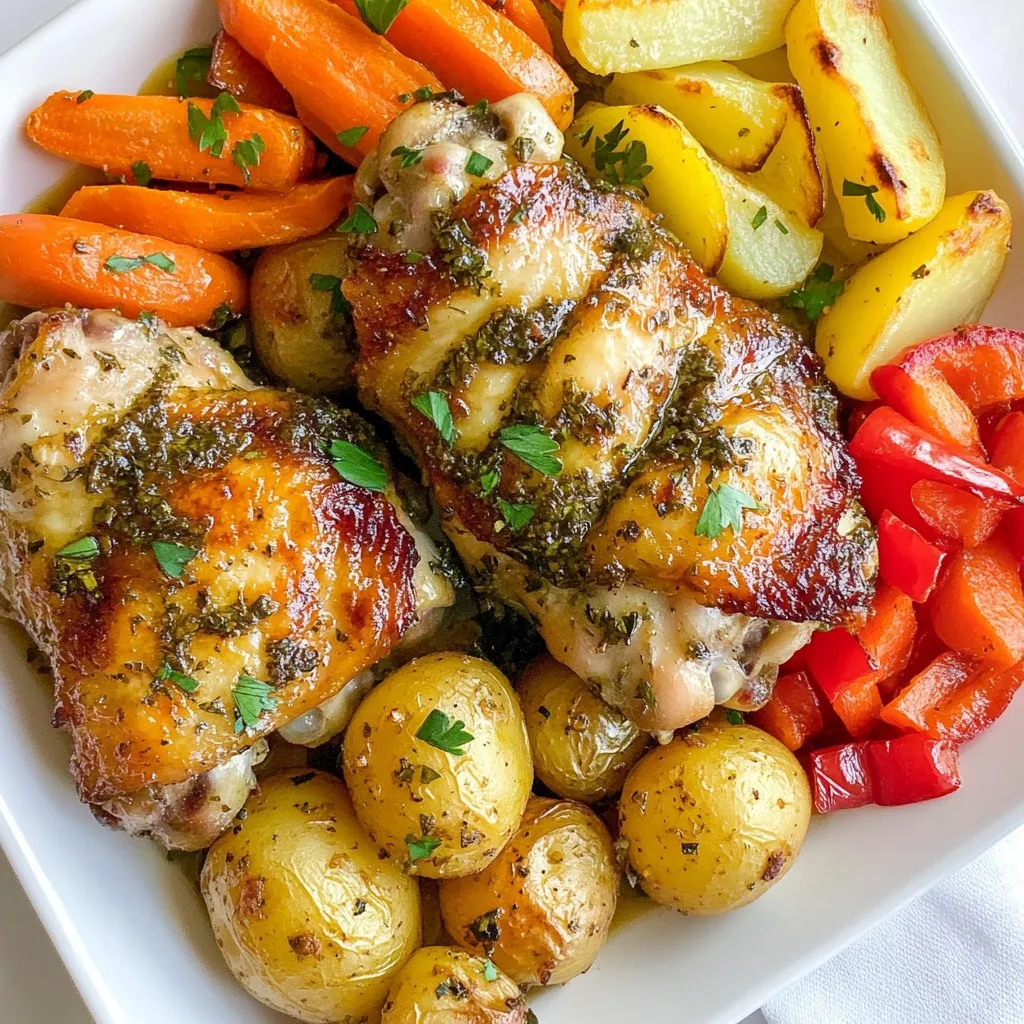 A delicious and aromatic dish featuring roasted chicken thighs and a medley of vegetables, seasoned with fresh herbs.