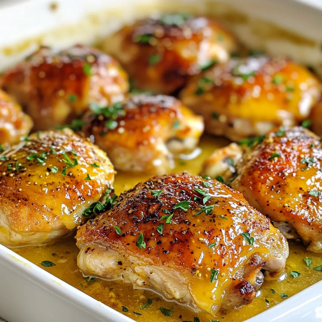 Deliciously glazed chicken thighs with a sweet and tangy honey mustard sauce.
