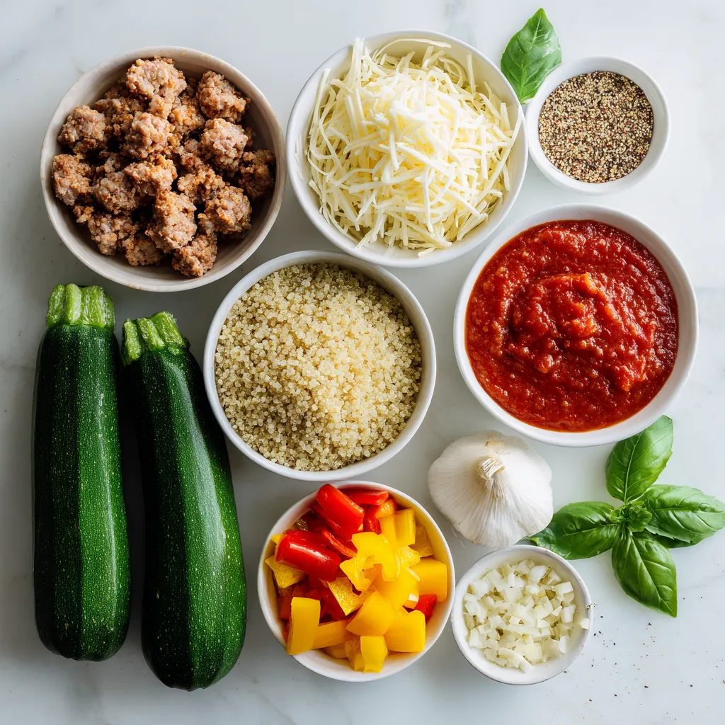 Keyword cheese, Italian sausage, quinoa, stuffed, zucchini