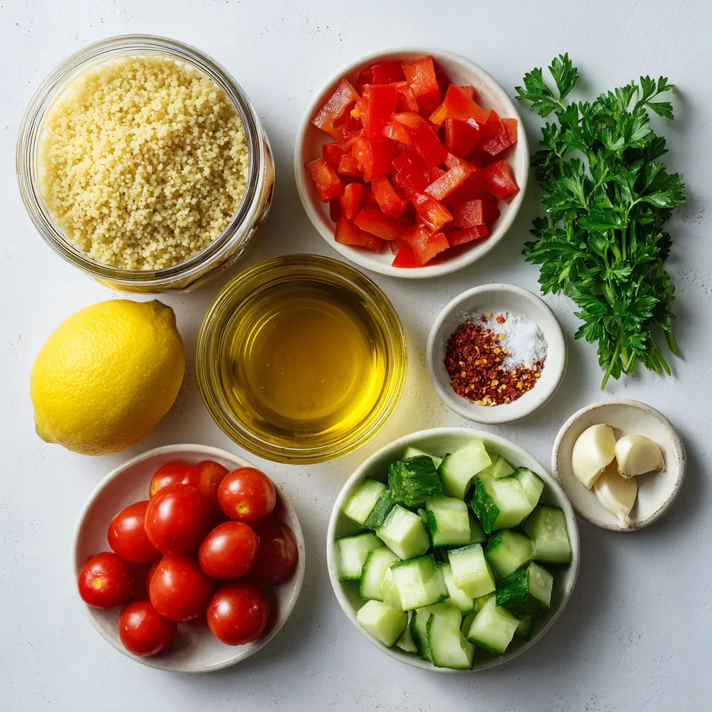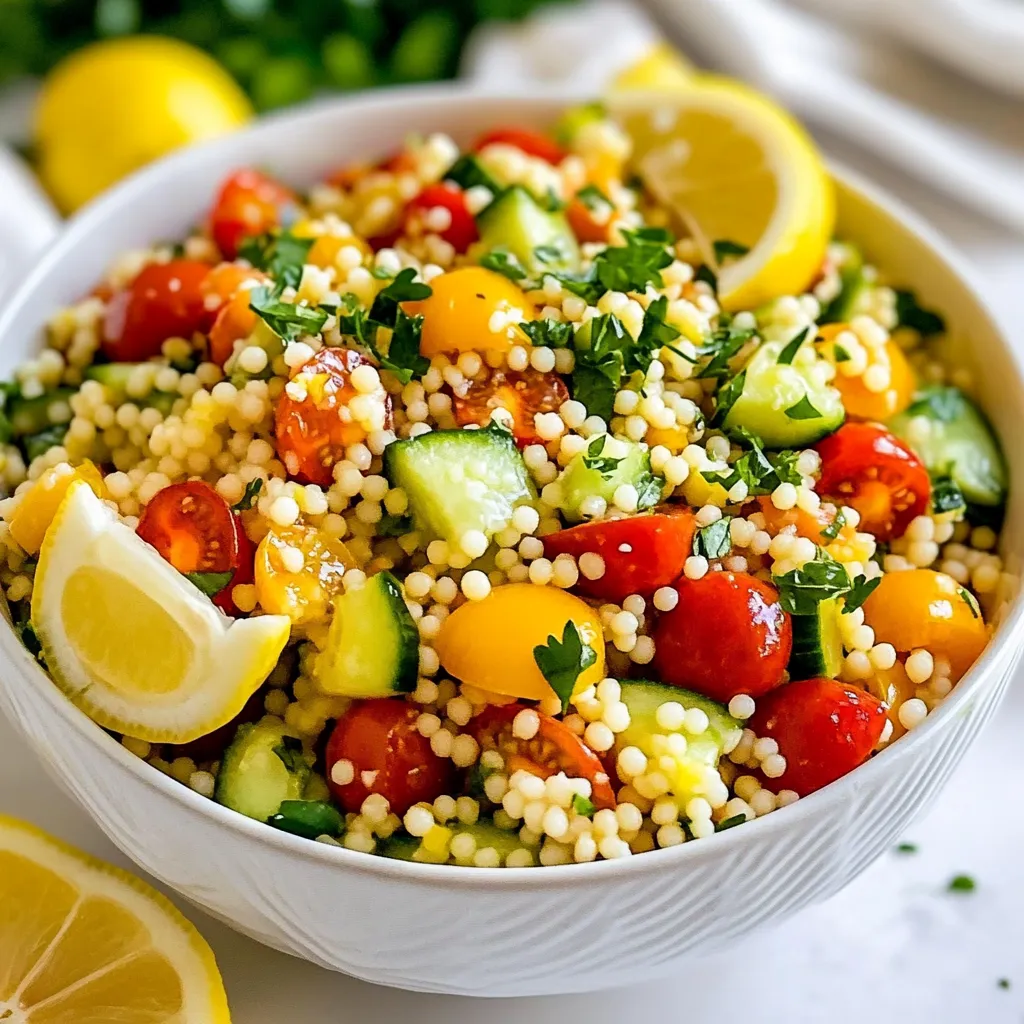 A refreshing salad with couscous, vegetables, and a zesty lemon-garlic dressing.