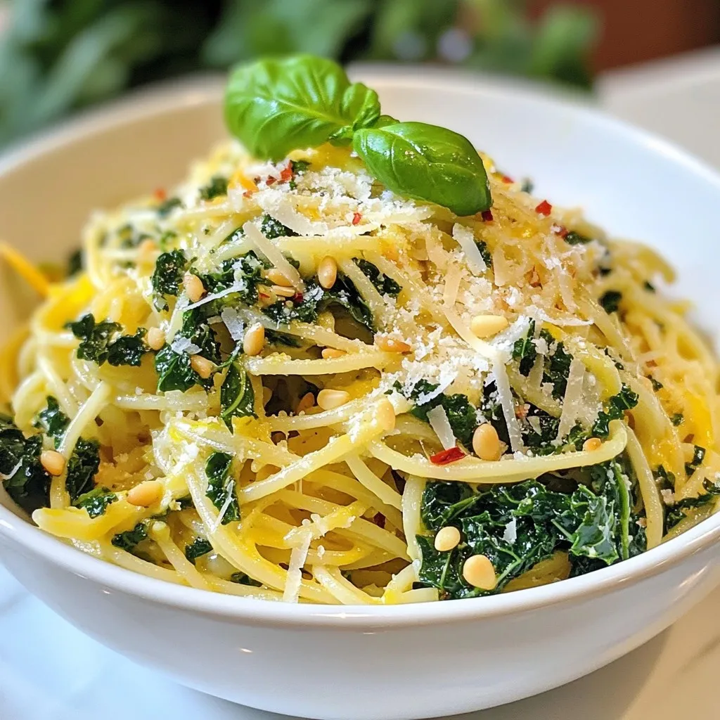 A delightful pasta dish featuring sautΓ©ed kale and garlic, brightened with lemon and topped with Parmesan.