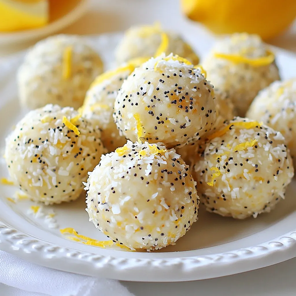 To make perfect Lemon Poppyseed Energy Balls, start by mixing the base well. Use a large bowl for easy stirring. Combine rolled oats, almond butter, and honey or maple syrup first. Make sure these three are blended together. Next, add the lemon zest, fresh lemon juice, poppy seeds, and salt. If you like, mix in shredded coconut and chopped nuts. Use your hands to ensure everything sticks together. After mixing, chill the mixture for 20-30 minutes. Chilling makes it easier to roll into balls.