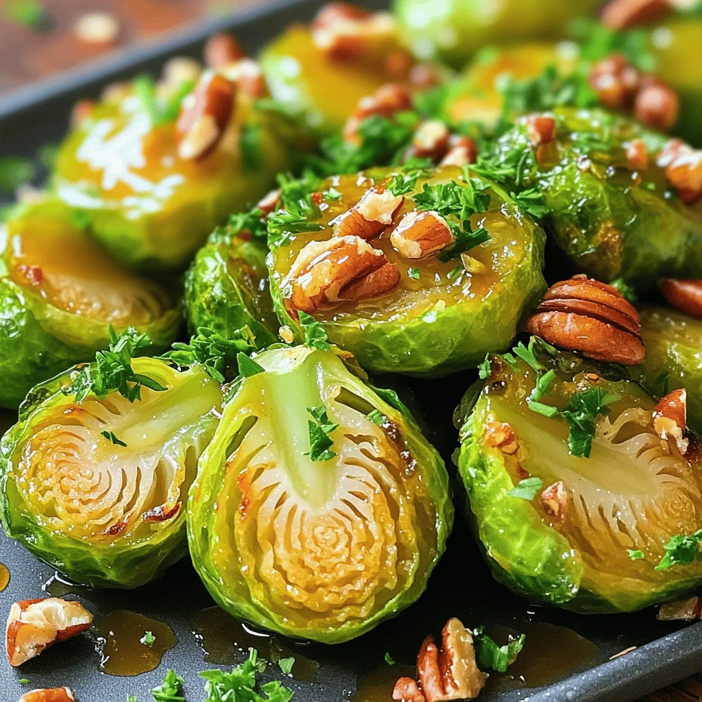 Preheat your oven to 400°F (200°C). Line a baking sheet with parchment paper for easy cleanup. Spread the Brussels sprouts cut side down on the sheet. This helps them caramelize nicely. Roast them for 20-25 minutes until golden brown and tender. Stir them halfway through for even cooking. If you want, add chopped pecans in the last five minutes for a crunchy bite. After roasting, let them cool for a minute, then taste and adjust the seasoning. Serve with fresh parsley on top for a beautiful finish.