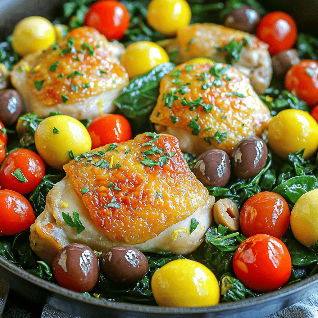 Each ingredient adds a special taste. The chicken thighs provide a juicy base. Olive oil ensures everything cooks well and adds flavor. Garlic brings a strong aroma that fills your kitchen. The lemon zest and juice give a bright and fresh taste. Oregano and smoked paprika add depth. The tomatoes and olives bring sweetness and saltiness. Finally, baby spinach adds a nice color and nutrition.