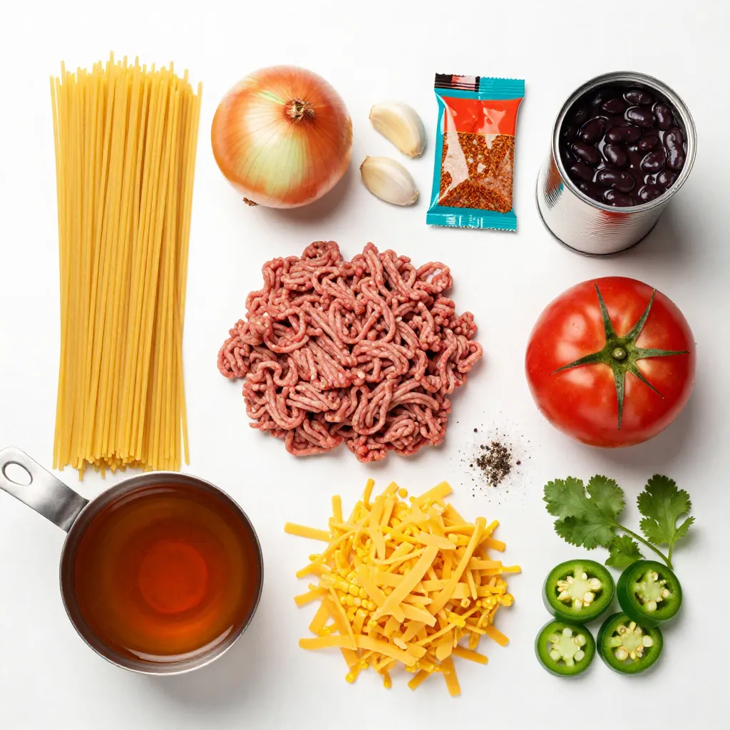 Each ingredient in this recipe plays a special role. The spaghetti acts as the base, soaking up all the tasty flavors. The ground beef or turkey adds protein and richness. The diced onion and garlic bring a savory depth. Taco seasoning gives the dish its signature kick. Black beans and corn add texture and heartiness. Tomatoes with chilies bring a slight heat and acidity. The broth helps cook the spaghetti and keeps everything moist. Finally, the cheese melts into a creamy topping. You can adjust the garnishes to fit your taste. Fresh cilantro adds brightness, while jalapeños can spice things up!