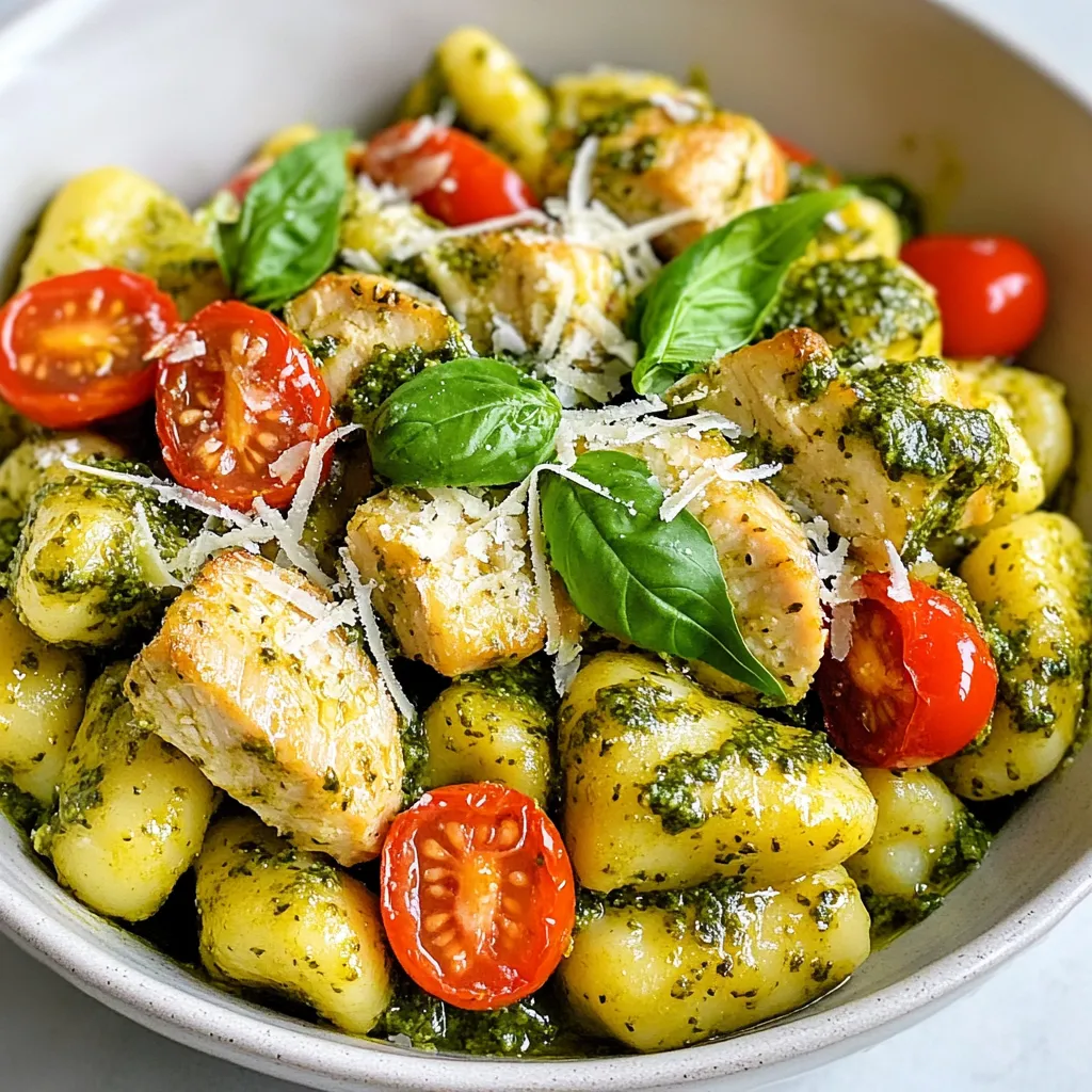 A delicious dish featuring chicken, gnocchi, and basil pesto, perfect for a quick meal.