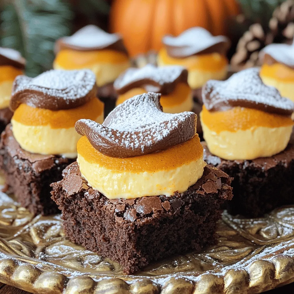 - 1 cup unsalted butter, melted - 2 cups granulated sugar - 1 cup light brown sugar, packed - 4 large eggs - 1 teaspoon vanilla extract - 1 cup all-purpose flour - 1 cup unsweetened cocoa powder - 1 teaspoon baking powder - 1/2 teaspoon salt - 1 cup semi-sweet chocolate chips - 1 cup pumpkin puree - 8 ounces cream cheese, softened - 1/2 cup powdered sugar - 1 teaspoon pumpkin pie spice - 1 teaspoon ground cinnamon To create these tasty Pumpkin Cheesecake Brownie Cupcakes, you need a mix of sweet and rich flavors. The melted butter gives a nice base. The blend of granulated and brown sugars adds depth. Eggs help bind everything together while giving moisture. Next, the all-purpose flour and cocoa powder bring the brownie texture. Baking powder and salt balance the sweetness. Semi-sweet chocolate chips add a delightful chocolate burst. The pumpkin puree provides creaminess and a seasonal flavor. Cream cheese, mixed with powdered sugar, makes the cheesecake layer smooth. Pumpkin pie spice and cinnamon add warmth and aroma. Gather these ingredients for a delightful treat that blends two favorites: brownie and cheesecake! - Step 1: Preheat the Oven Start by preheating your oven to 350°F (175°C). Line a muffin tin with cupcake liners. This helps the cupcakes come out easily. - Step 2: Make the Brownie Base In a large bowl, mix melted butter, granulated sugar, and brown sugar until smooth. Add the eggs, one by one, mixing well after each one. Finally, stir in the vanilla extract. - Step 3: Combine Dry Ingredients In another bowl, whisk together flour, cocoa powder, baking powder, and salt. Slowly fold this dry mix into the wet mix until just combined. Then, stir in the chocolate chips. - Step 4: Prepare the Cheesecake Mixture In a separate bowl, beat softened cream cheese with powdered sugar until smooth. Then, add pumpkin puree, pumpkin pie spice, and ground cinnamon. Mix until creamy and well blended. - Step 5: Assemble Cupcakes Divide the brownie batter into the lined muffin cups, filling each halfway. Spoon the pumpkin cheesecake mixture on top. Use a toothpick to swirl the two mixtures together for a lovely marbled look. - Step 6: Bake Bake the cupcakes in the oven for 20-25 minutes. Check them by inserting a toothpick into the brownie part. If it comes out clean, they are done. The cheesecake may look a bit soft, and that's okay. Bake your cupcakes for 20-25 minutes at 350°F. After baking, let them cool in the pan for about 10 minutes. Then, move them to a wire rack to cool completely. For a nice touch, dust them with powdered sugar before serving. To ensure a perfect brownie texture, start with melted butter. It helps create a moist and fudgy base. Mix the sugars well with the butter. This step adds air to your batter. Beat in the eggs one at a time. This keeps the mixture smooth. For the best cheesecake swirl, use softened cream cheese. It blends well with the other ingredients. Mix until smooth before adding the pumpkin. Swirl it gently into the brownie batter. A toothpick works well for this. Don’t overmix; you want a marbled look. For optional presentation, serve your cupcakes on a decorative platter. It adds a nice touch. Dust them lightly with powdered sugar before serving. This gives a lovely contrast to the color. Garnish with a sprinkle of cinnamon for flavor. A dollop of whipped cream also looks great. These small touches make your cupcakes shine. They will impress your family and friends. {{image_2}} You can change up the taste of your Pumpkin Cheesecake Brownie Cupcakes with fun flavors. Try adding spices like nutmeg or ginger. Each spice brings a new twist. You can also use different types of chocolate. Dark chocolate or white chocolate can work great. Each chocolate type adds its own flavor and richness to the brownies. Experimenting with these options can make your cupcakes even more exciting. If you need gluten-free options, swap regular flour for a gluten-free blend. Make sure the blend has a good texture. For dairy-free alternatives, use vegan cream cheese. You can also replace butter with coconut oil. Check labels to ensure all ingredients match your needs. These swaps let everyone enjoy these tasty treats without worry. To keep your Pumpkin Cheesecake Brownie Cupcakes fresh, store them in an airtight container. This method helps prevent them from drying out. You can use a plastic or glass container with a tight lid. Place parchment paper between layers if stacking them. This keeps the frosting intact and prevents sticking. If you want to freeze these tasty cupcakes, first let them cool completely. Wrap each cupcake in plastic wrap. Then place them in a freezer-safe bag or container. This keeps them safe from freezer burn. To enjoy later, take them out and thaw in the fridge overnight. For the best taste, eat them within three months. Enjoy the pumpkin flavor as if they were fresh! Pumpkin Cheesecake Brownie Cupcakes last about 3 to 5 days when stored correctly. Store them in an airtight container at room temperature. For longer freshness, keep them in the fridge. Yes, you can make these cupcakes in advance. Bake and cool them, then store them in the fridge for up to 2 days. You can also freeze them for up to a month. Just thaw before serving. If you need a substitute for pumpkin puree, use mashed sweet potato or butternut squash. Both options provide a similar texture and flavor. You can also use applesauce for a different taste. You can use ricotta cheese or mascarpone cheese instead of cream cheese. Both will give a creamy texture. However, the taste may differ slightly from the classic cheesecake flavor. Absolutely! These cupcakes are perfect for kids. The brownie base and sweet pumpkin cheesecake mix create a fun treat. They are great for parties or family gatherings. Kids will love them! This blog post showed you how to make Pumpkin Cheesecake Brownie Cupcakes step by step. We covered the ingredients, preparation, baking tips, and storage methods. You now ha