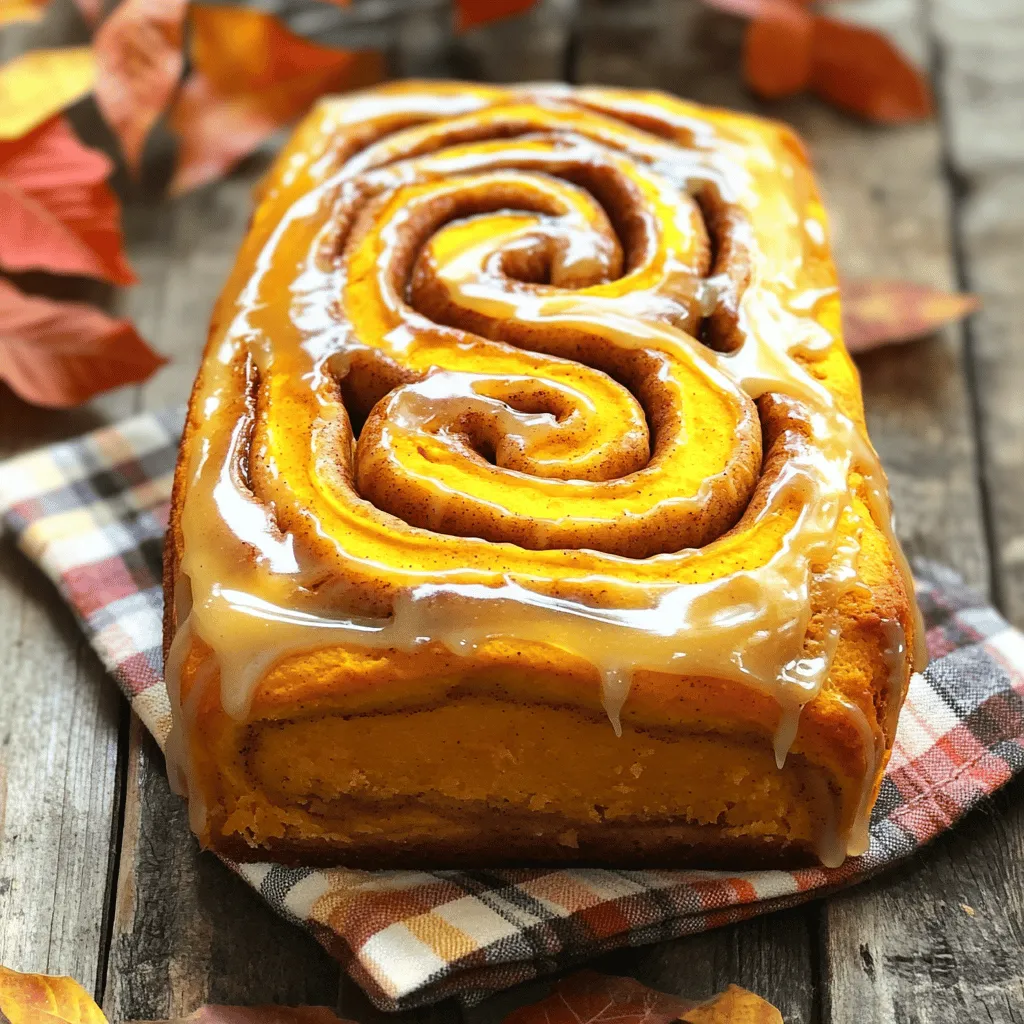 - 2 cups all-purpose flour - 1/2 cup brown sugar - 1/4 cup granulated sugar - 2 teaspoons baking powder - 1 teaspoon baking soda - 1 teaspoon ground cinnamon - 1 teaspoon ground nutmeg - 1/2 teaspoon ground ginger - 1/2 teaspoon salt The dry ingredients are the backbone of your loaf. All-purpose flour gives it structure. Brown sugar adds a rich, caramel flavor. Granulated sugar balances this with sweetness. Baking powder and baking soda help it rise perfectly. The spices, like cinnamon and nutmeg, bring warmth and comfort to the dish. Salt enhances all these flavors, making them pop. - 1 cup pumpkin puree - 1/2 cup buttermilk - 1/4 cup unsalted butter, melted - 2 large eggs The wet ingredients bring moisture and flavor. Pumpkin puree gives the loaf its signature taste and color. Buttermilk adds tang and keeps it moist. Melted butter enriches the loaf, while eggs bind everything together. Together, they create a delicious, tender crumb. - 1 cup powdered sugar - 2 tablespoons milk - 1 teaspoon vanilla extract The glaze is the final touch. It adds sweetness and a glossy finish. Powdered sugar blends smoothly with milk and vanilla. This glaze makes each slice look inviting. It's simple but elevates the loaf to something special. - Preheat your oven to 350°F (175°C). - Grease a loaf pan with butter or cooking spray. This step helps the loaf slide out easily. - In a large bowl, mix 2 cups of flour, 1/2 cup brown sugar, and 1/4 cup granulated sugar. - Add 2 teaspoons baking powder, 1 teaspoon baking soda, 1 teaspoon ground cinnamon, 1 teaspoon ground nutmeg, 1/2 teaspoon ground ginger, and 1/2 teaspoon salt. Stir until everything is well combined. - In a separate bowl, whisk together 1 cup pumpkin puree, 1/2 cup buttermilk, 1/4 cup melted butter, and 2 large eggs. Make sure it’s smooth and creamy. - Gradually mix the wet ingredients into the dry ingredients. Stir gently until just combined. It’s okay if there are a few lumps. Avoid overmixing; this keeps the loaf soft. - In a small bowl, mix 1/4 cup brown sugar and 1 tablespoon ground cinnamon. This will add a sweet spice to your loaf. - Pour half of the batter into the greased loaf pan. - Sprinkle half of the cinnamon filling over the batter. - Pour the rest of the batter on top, then add the remaining cinnamon filling. - Use a knife to swirl the batter gently. This will create a beautiful marbled effect. - Place the loaf in the oven and bake for 50-60 minutes. Check doneness by inserting a toothpick; it should come out clean. - If the top gets too dark, cover it loosely with foil. - Let the loaf cool in the pan for about 10 minutes, then transfer it to a wire rack to cool completely. - In a small bowl, mix 1 cup powdered sugar, 2 tablespoons milk, and 1 teaspoon vanilla extract. Stir until smooth. - Once the loaf is cool, drizzle the glaze over the top. Let it set for a few minutes before slicing. To get the best texture, use room temperature ingredients. Cold butter or eggs can make your loaf dense. Mixing is also key. Stir gently until just combined. A few lumps are fine. Overmixing can lead to a tough loaf. Want to kick up the flavor? Try adding nuts or chocolate chips. Walnuts or pecans add a nice crunch. Chocolate chips can make it extra sweet. You can also play with spices. Add more cinnamon, or try cardamom or cloves for a new twist. Sometimes, things go wrong. Overmixing makes the loaf dry and tough. If the top browns too quickly, cover it with foil. This lets the inside cook without burning the crust. Keep an eye on your loaf while it bakes. {{image_2}} You can make this loaf healthier by swapping whole wheat flour for all-purpose flour. Whole wheat flour adds fiber and nutrients. It gives the loaf a nutty taste too. You can also cut down on sugar. Try using less brown sugar or a sugar substitute. This keeps the sweet flavor while reducing calories. Want to change up the flavor? Add different spices like allspice or clove. These spices can give a warm, rich taste. You could also mix in chocolate chips or caramel. These add sweetness and a fun twist to your loaf. This loaf pairs well with coffee or tea. The warm spices complement your drink perfectly. You can serve it warm for a cozy treat. However, it's just as tasty when cold. Enjoy it however you like! To keep your Pumpkin Spice Cinnamon Roll Loaf fresh, store it in an airtight container. This will help maintain its moisture and flavor. Place it on your kitchen counter if you plan to eat it within three days. Keep it away from direct sunlight and heat sources. For longer freshness, you can refrigerate it. Just make sure to wrap it well with plastic wrap or foil to avoid drying out. If you want to save your loaf for later, freezing is a great option. First, let the loaf cool completely. Then, wrap it tightly in plastic wrap and aluminum foil. This prevents freezer burn and keeps it fresh. You can freeze it for up to three months. When you're ready to enjoy it again, take the loaf out and let it thaw in the fridge overnight. For a quick warm-up, slice it and pop it in the microwave for about 20 seconds. This way, you’ll have a deliciously warm treat ready to enjoy. To keep your loaf moist, use these tips: - Add an extra egg for richness. - Use full-fat buttermilk instead of low-fat. - Don’t overbake; check it a few minutes early. - Let the loaf cool in the pan for 10 minutes. These steps help trap moisture. A moist loaf tastes great and feels soft. Yes, you can use fresh pumpkin. Here’s how: - Cut the pumpkin and remove the seeds. - Roast it until soft, then mash it well. - Measure it out after mashing, using the same amount as canned. Fresh pumpkin has a different flavor. It can make your loaf taste even better! If you don’t have buttermilk, try these: - Use milk mixed with vinegar or lemon juice. Use 1 cup milk and 1 tablespoon vinegar. - Yogurt thinned with a little water also works. These substitutes keep the loaf tender and fluffy. They help it rise just right. To 