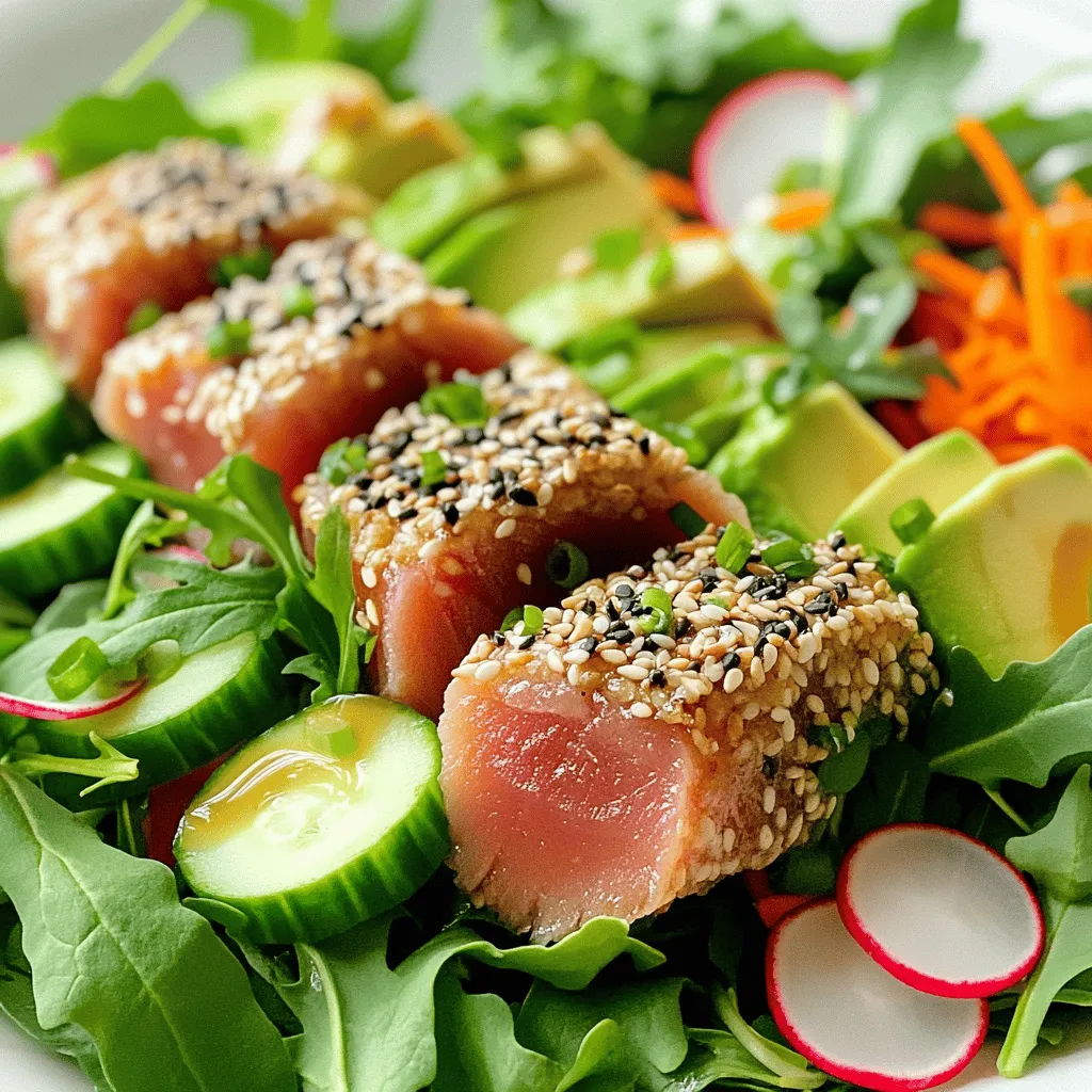 For a stunning salad, layer your ingredients. Start with mixed greens, then add cucumber, carrot, and avocado. Arrange the sliced tuna on top. This way, each layer shows through. Use garnishes like extra sesame seeds and chopped green onions. They add color and texture, making your dish pop!
