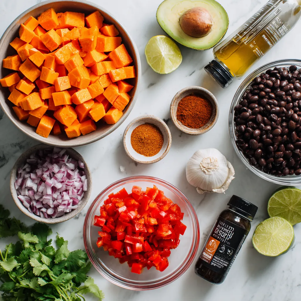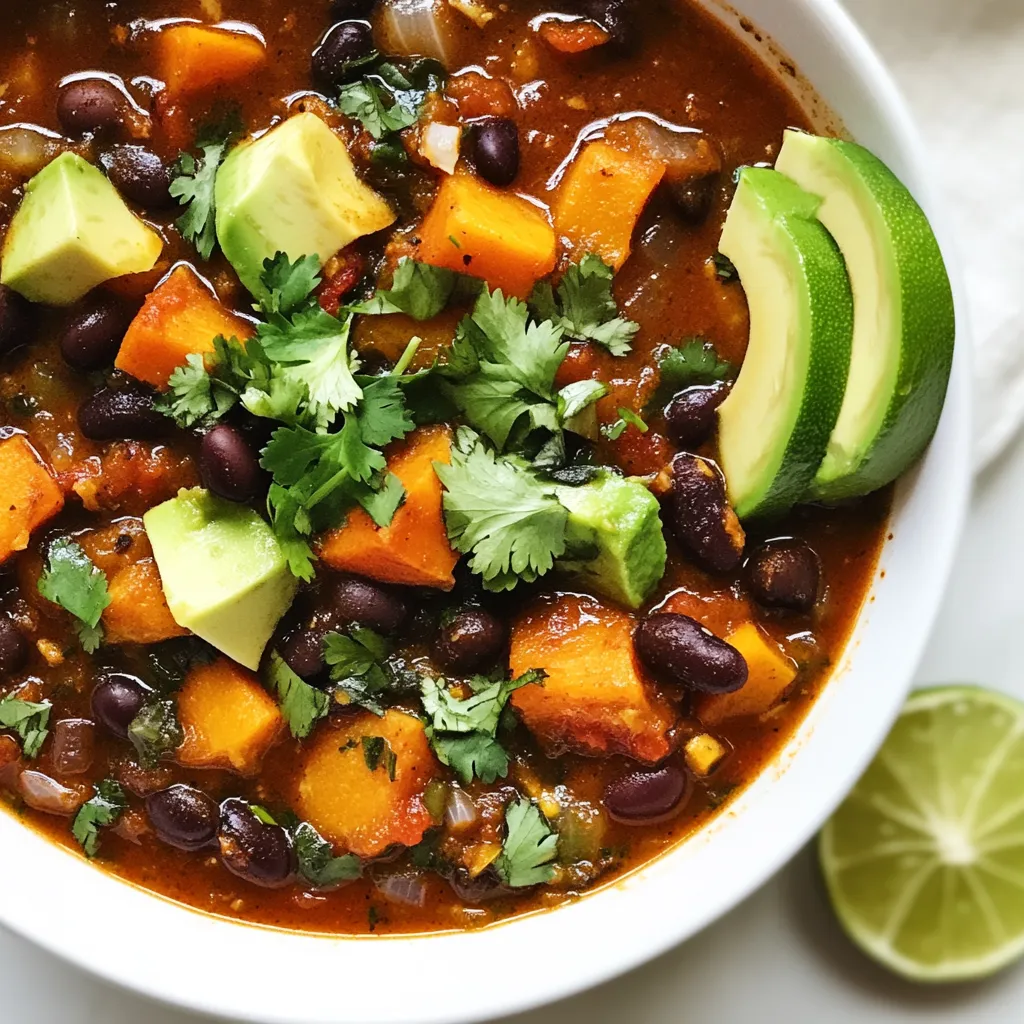 - 2 medium sweet potatoes, peeled and diced - 1 can (15 oz) black beans, drained and rinsed - 2 cups vegetable broth - 1 can (14 oz) diced tomatoes with green chilies - 1 onion, diced - 3 cloves garlic, minced - 1 red bell pepper, diced - 2 teaspoons ground cumin - 2 teaspoons chili powder - 1 teaspoon smoked paprika - 1 tablespoon olive oil - Salt and pepper to taste - Fresh cilantro - Avocado slices - Lime wedges Gathering these ingredients sets you up for a tasty chili. The sweet potatoes bring a creamy texture. Black beans give protein and fiber. Vegetable broth adds depth and flavor. Diced tomatoes with green chilies pack a punch. Onion and garlic enhance the overall taste. Red bell pepper adds a sweet crunch. Spices like cumin and chili powder make it warm. For garnishes, fresh cilantro brightens each bowl. Avocado slices add creaminess. Lime wedges give a zesty kick. You can mix and match these ingredients based on what you have. This chili is easy to make and packed with flavor! {{ingredient_image_1}} 1. Start by peeling and dicing the sweet potatoes. Aim for small, even cubes for quick cooking. 2. Dice the onion and red bell pepper. Mince the garlic cloves. 3. Heat one tablespoon of olive oil in a large pot over medium heat. 4. Once hot, add the diced onion to the pot. Sauté for about 3-4 minutes until it turns soft. 5. Add the minced garlic and diced red bell pepper. Cook for another 2 minutes until fragrant. 1. Next, add the diced sweet potatoes to the pot. Stir well to mix everything together. 2. Pour in 2 cups of vegetable broth and add one can of diced tomatoes with their juice. 3. Rinse and drain one can of black beans. Stir them into the pot as well. 4. Season the chili with 2 teaspoons of ground cumin, 2 teaspoons of chili powder, 1 teaspoon of smoked paprika, salt, and pepper to taste. 5. Mix well to combine all the flavors. 6. Bring the mixture to a boil. Then, reduce the heat to a simmer. 7. Cover the pot and cook for about 25-30 minutes. Check often until the sweet potatoes are tender. 1. Taste the chili and adjust seasoning as needed. 2. If you want a thicker chili, mash some sweet potato pieces against the pot's side using a fork. 3. Once ready, remove from heat and let it sit for a few minutes. 4. Serve the chili in bowls. Top with fresh cilantro, avocado slices, and a squeeze of lime for added flavor. 5. Enjoy with warm tortilla chips or crusty bread for a complete meal. How to customize the spice level You can adjust the heat in your chili easily. For mild chili, use less chili powder. Add more if you prefer a spicy kick. You can also use fresh jalapeños for heat. Just slice them thin and add them while cooking. If you want to cool it down, add a dollop of sour cream or yogurt when serving. Best herbs to add for freshness Adding fresh herbs can elevate your chili. Cilantro is a great choice for a bright flavor. You can also try fresh parsley or green onions. Add these herbs right before serving for the best taste. Tips for checking sweet potato doneness To check if your sweet potatoes are done, use a fork. If it goes in easily, they are ready. If they are still firm, let them cook a bit longer. Stir the chili occasionally to ensure even cooking. Techniques for a thicker chili If you want a thicker chili, there are simple tricks. One way is to mash some sweet potato against the pot with a fork. You can also let it simmer longer without a lid. This helps the liquid reduce and thicken the chili. Suggested side dishes This chili pairs well with many sides. Cornbread is a classic choice. You can also serve it with tortilla chips or a fresh salad. These sides add texture and balance to the meal. Best beverages to complement the chili A cool drink goes great with spicy chili. Try iced tea, lemonade, or a light beer. These drinks can refresh your palate and enhance the meal. Pro Tips Perfect Sweet Potatoes: To ensure your sweet potatoes cook evenly, make sure they are all cut into similar-sized cubes. Spice Adjustment: If you prefer a milder chili, reduce the amount of chili powder or use a mild variety of diced tomatoes. Make it Heartier: Add more protein by incorporating cooked quinoa or lentils along with the black beans for added texture. Storage Tips: This chili can be stored in the fridge for up to 5 days or frozen for up to 3 months, making it perfect for meal prep! {{image_2}} You can easily make this chili fit many diets. For a vegan or vegetarian option, you already have a great base. The sweet potatoes and black beans are hearty and filling. Just make sure to use vegetable broth, like the recipe suggests. This will keep your dish plant-based and delicious. If you need a gluten-free option, this chili shines. All the main ingredients are naturally gluten-free. Just check that your vegetable broth has no added gluten. This chili is perfect for everyone. If you want to try other beans, go for it. Kidney beans or pinto beans make great substitutes. They add different textures but still taste good. You can also mix beans for added fun. Want to switch up the veggies? You can use zucchini, corn, or carrots. Just chop them up and add them to the pot. Each swap adds its own unique flavor and color. To boost the flavor, add different spices or sauces. For more heat, toss in cayenne pepper or jalapeños. If you love a smoky taste, try adding chipotle sauce. You can also explore regional chili styles. For a Tex-Mex twist, add some cumin and oregano. For a more Caribbean flair, include coconut milk and lime juice. Each change can turn this chili into a new dish. To store leftover chili, let it cool first. Once cool, transfer it to an airtight container. This helps keep the chili fresh and safe. You can store it in the fridge for about 4 to 5 days. Make sure to label the container with the date you made it. Freezing chili is easy. Use a freezer-safe container or freezer bags for storage. Leave some space at the top of the container, as the chili will expand when it freez
