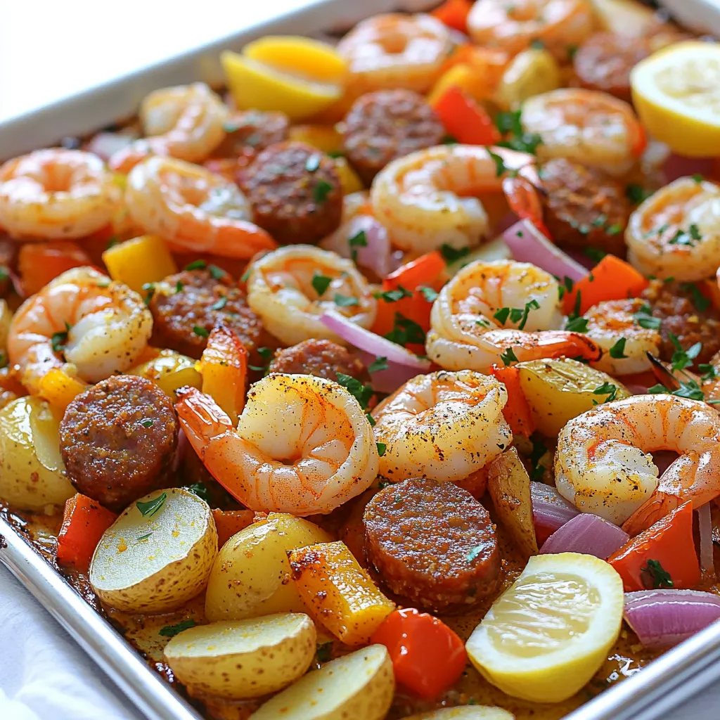 The main ingredients create a vibrant mix of flavors and textures. The shrimp brings a sweet, tender bite. Andouille sausage adds a nice smoky taste. Baby potatoes provide a hearty base. Bell pepper and red onion add crunch and color. Garlic gives it a rich aroma.